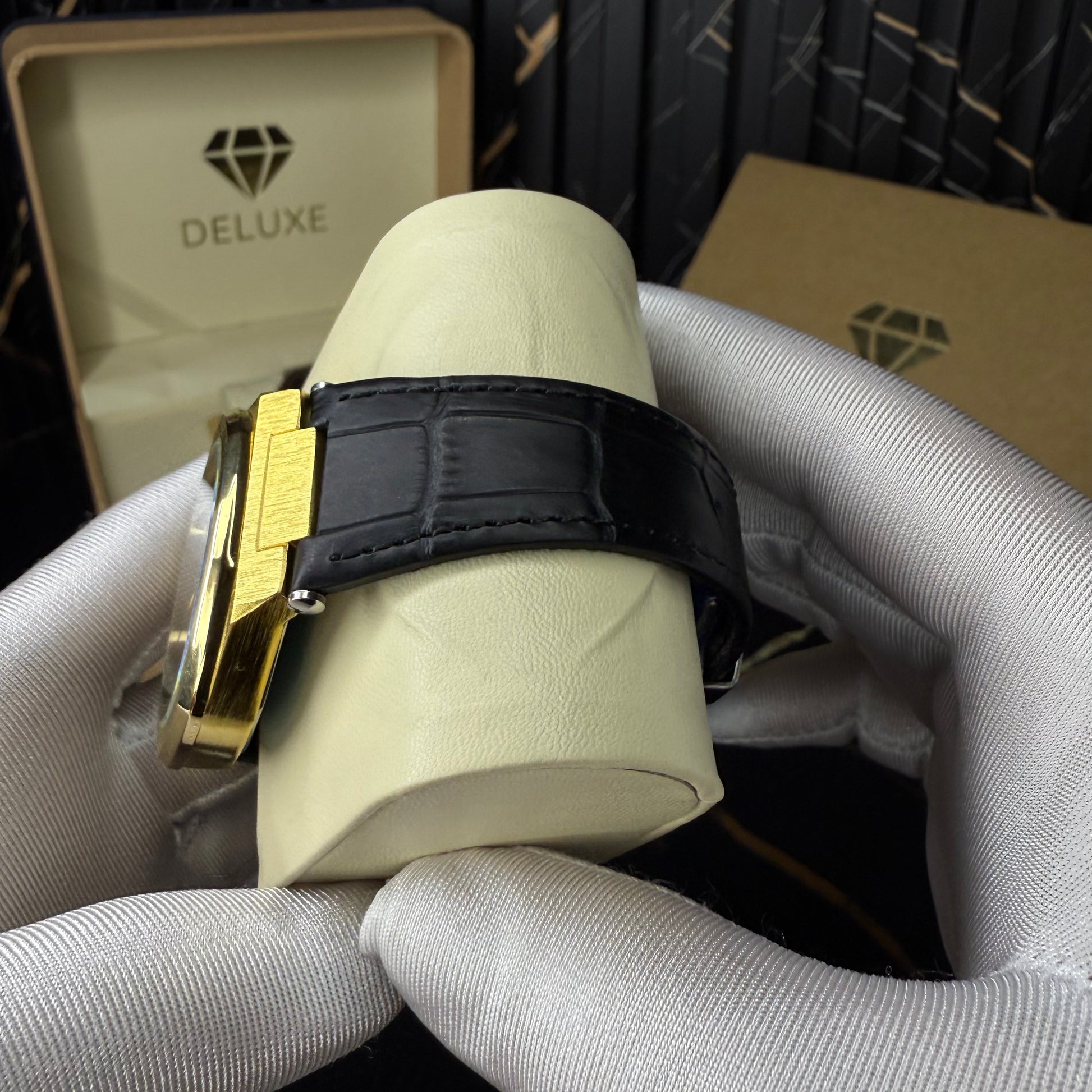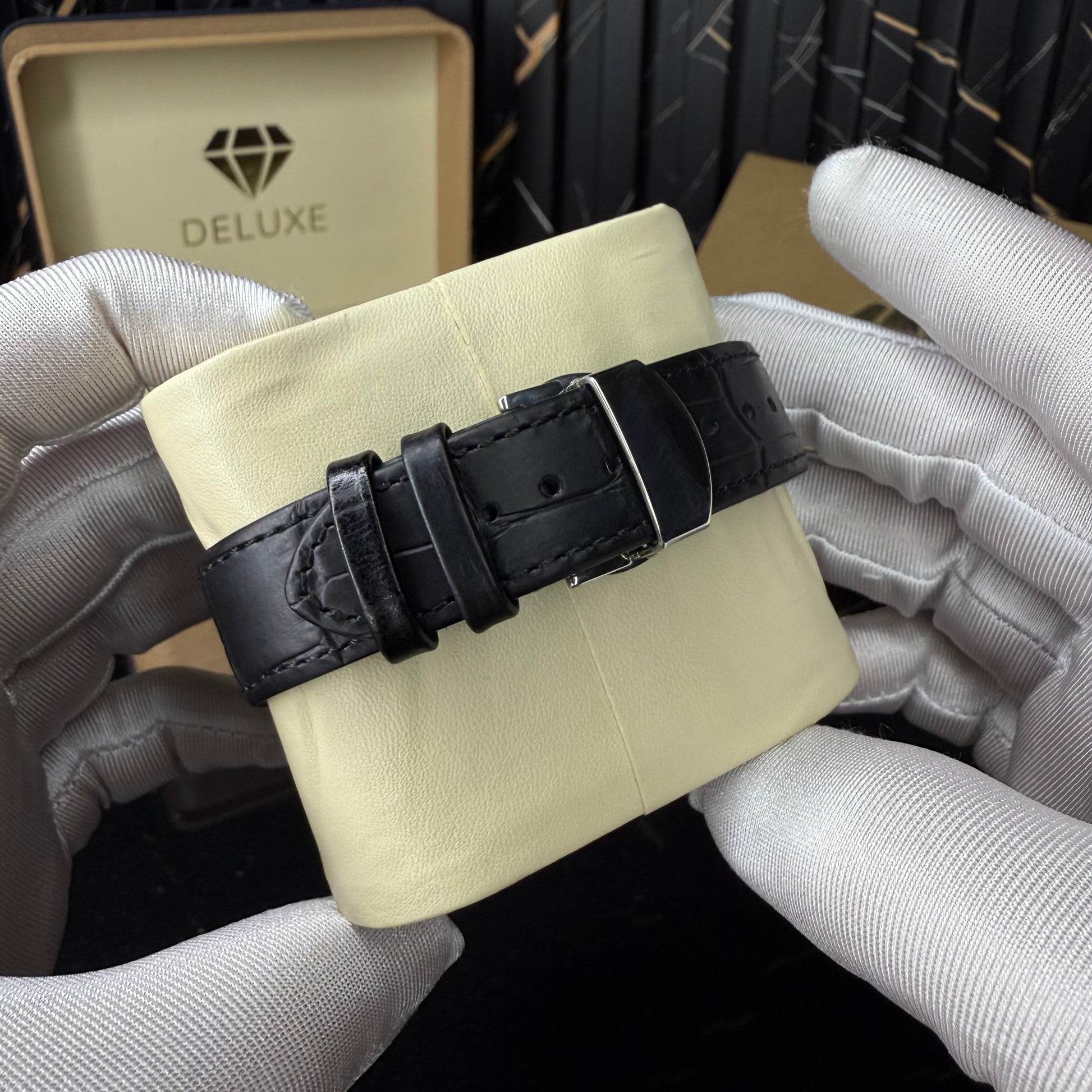Paired with a smooth black leather strap, the watch sits comfortably on the wrist while elevating both formal and smart-casual styles. The overall result is confident, elegant, and unmistakably luxurious.