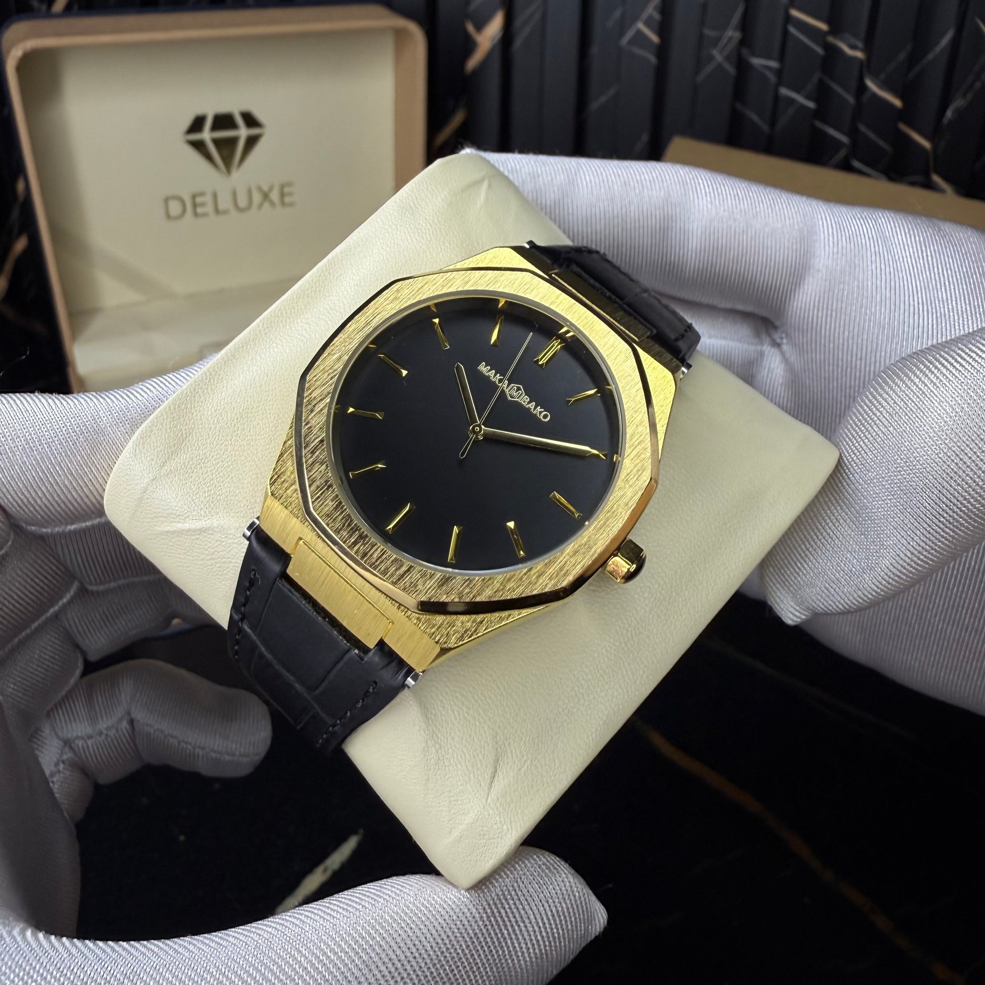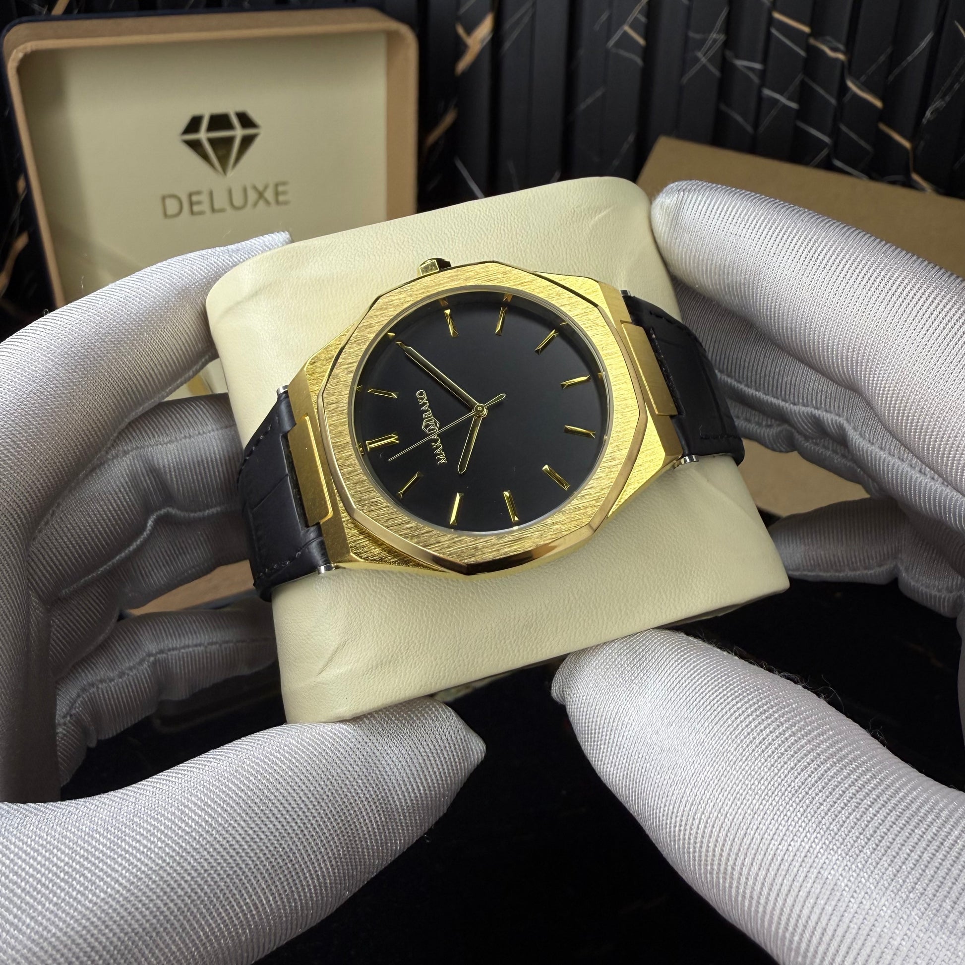 This refined timepiece is designed for men who appreciate elegance with a strong architectural identity. The octagonal case, finished in brushed gold, delivers a commanding presence while maintaining a clean, sophisticated silhouette. Its sharp lines and polished edges reflect light beautifully, giving the watch a premium, sculpted feel.