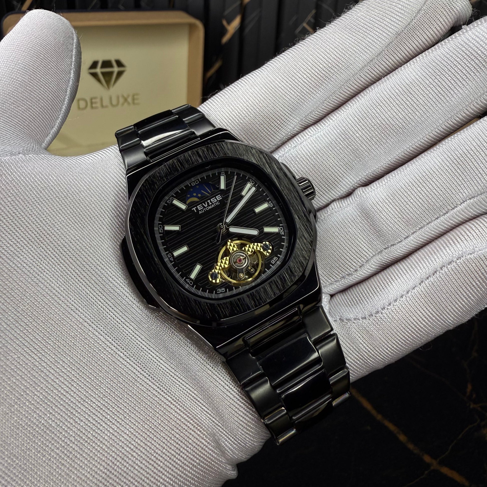 The brushed black case surrounds a textured dial with horizontal detailing, while the open-heart window reveals the golden balance wheel in motion, adding depth and character. Luminous hands and applied indices provide clarity and contrast, enhanced by polished case accents that catch the light elegantly. Finished with a seamless black stainless-steel bracelet and a transparent case back showcasing the automatic movement, this watch delivers a powerful presence with meticulous attention to detail.