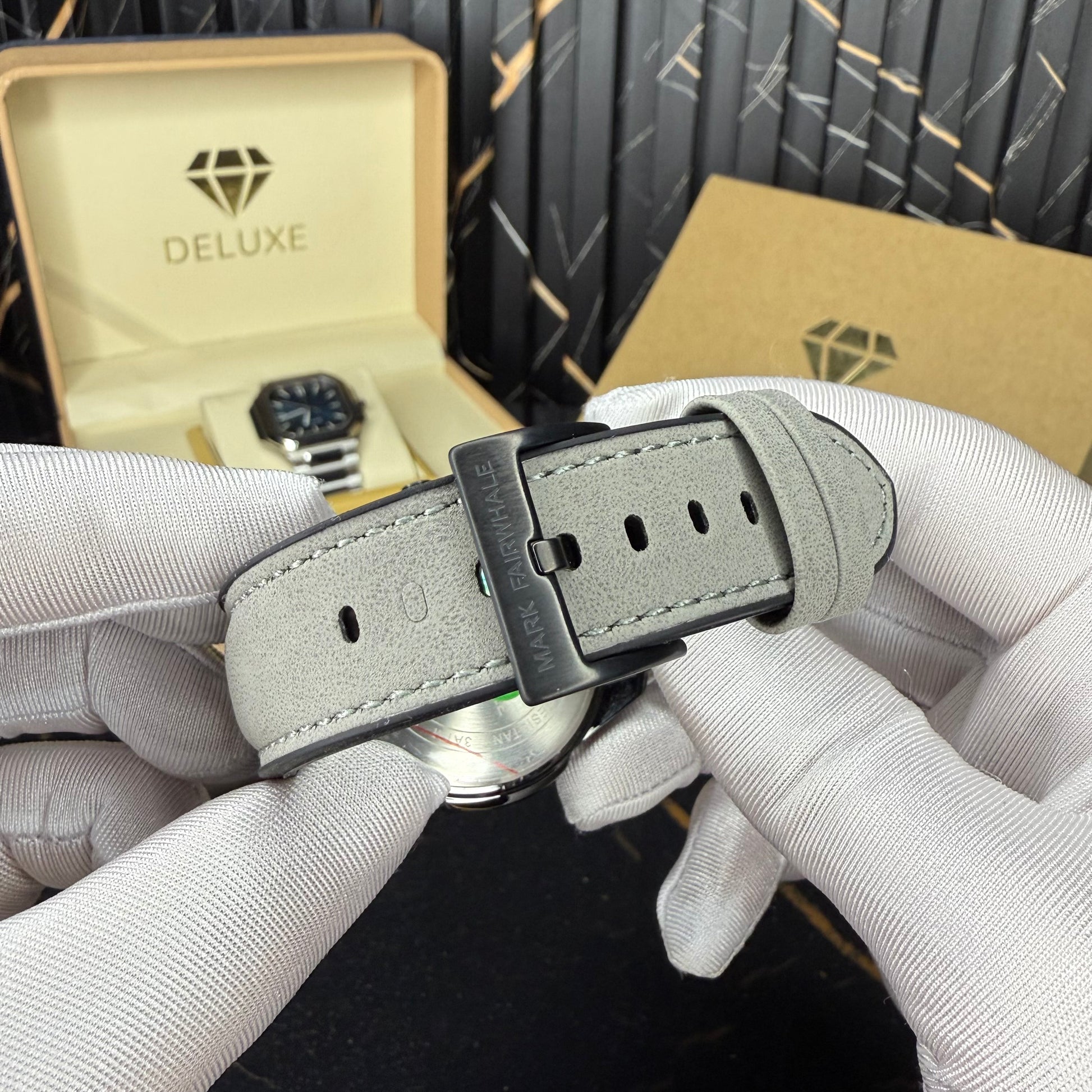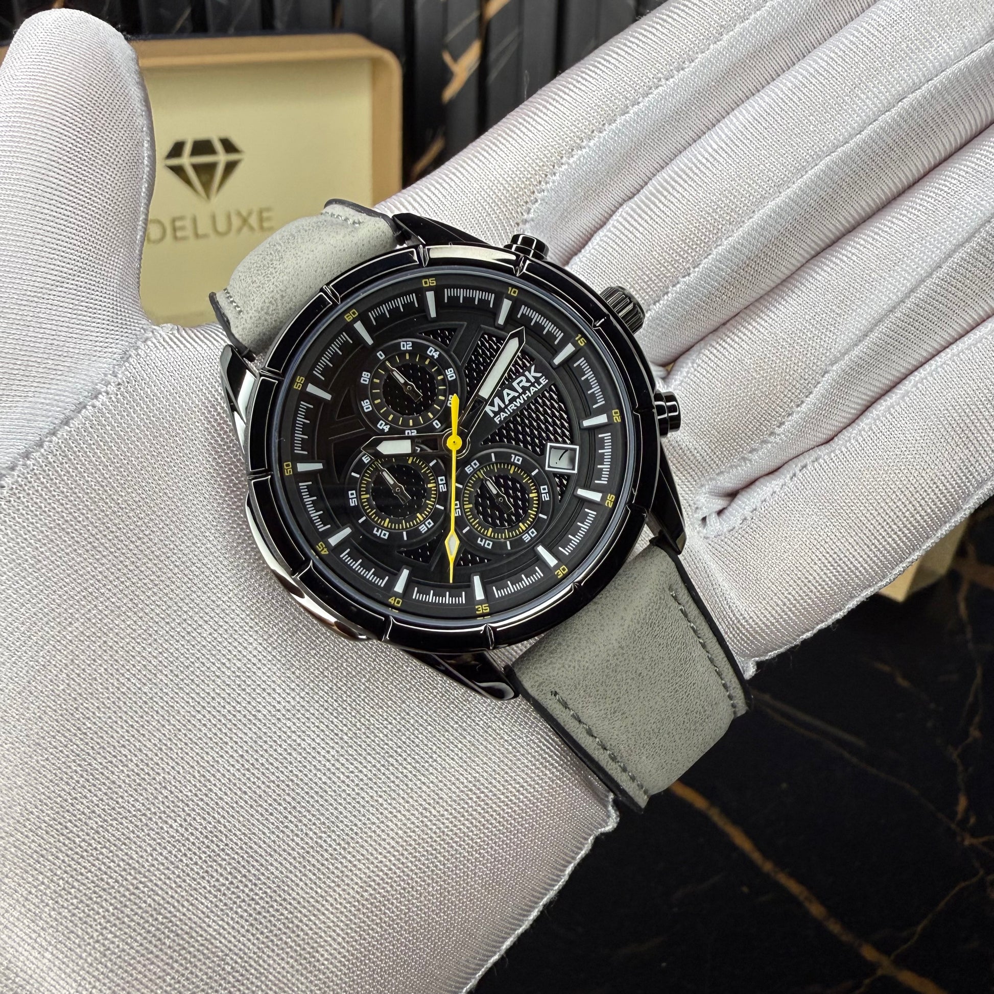 This timepiece stands out through its sharp attention to detail, blending a bold chronograph layout with refined finishes. The deep black dial is layered with textured sub-dials, precise minute markings, and contrasting yellow accents that bring energy and clarity to the design, while the polished black case adds a sleek, modern presence. Paired with a soft grey suede strap, stitched cleanly for a premium feel, the watch balances sportiness with eleganceβevery element thoughtfully aligned to create a confident, visually striking watch that feels just as impressive up close as it does on the wrist.