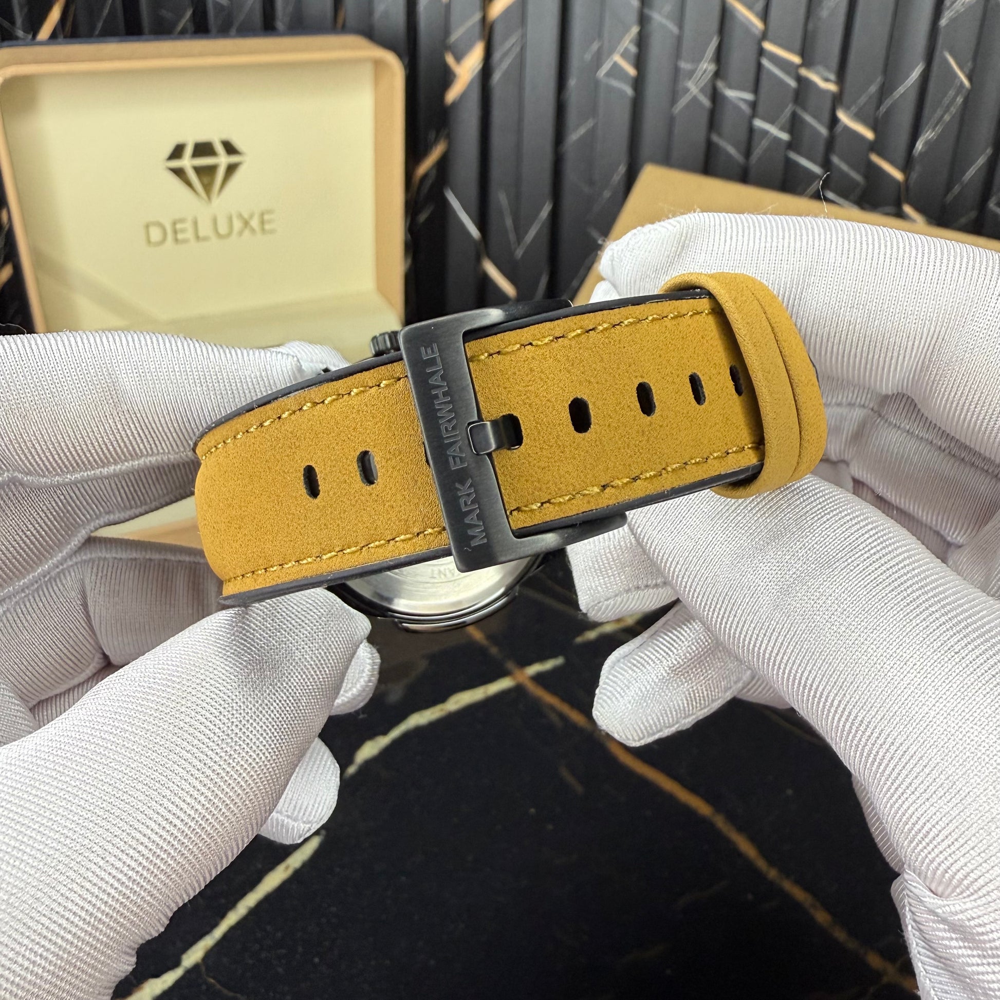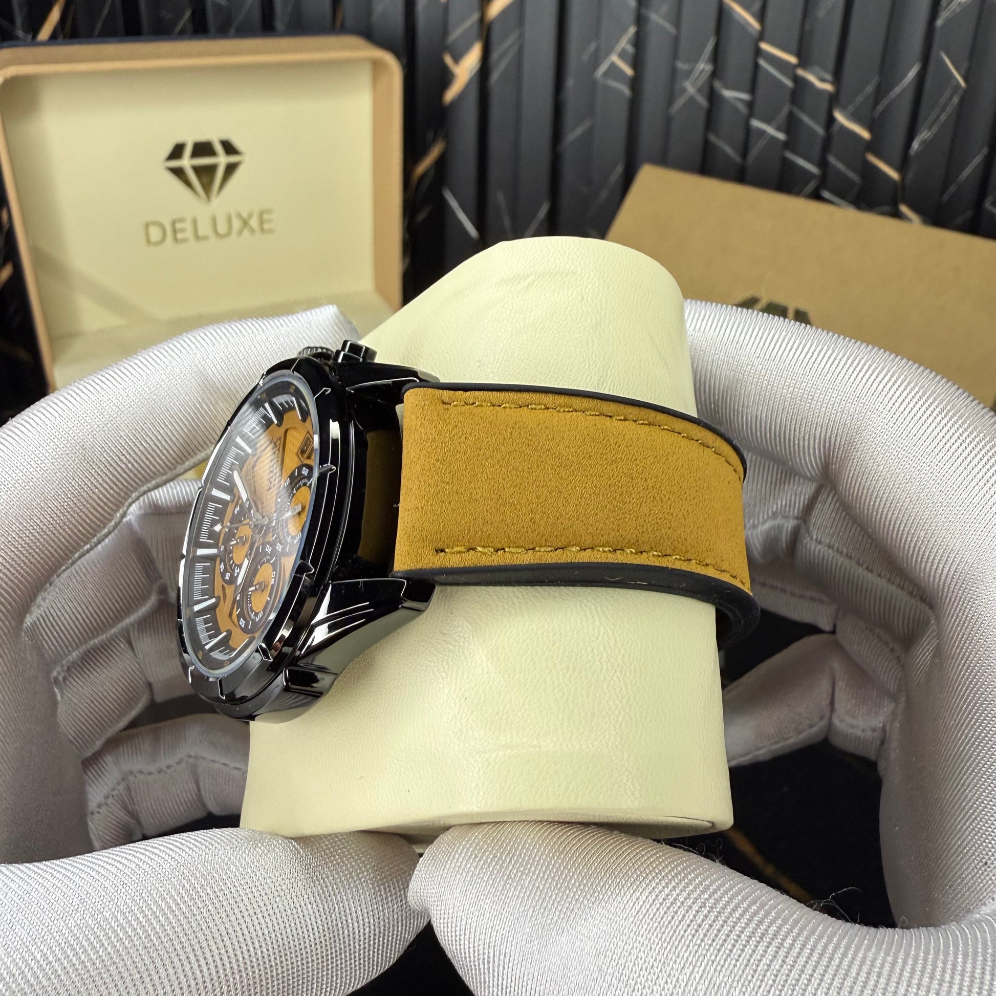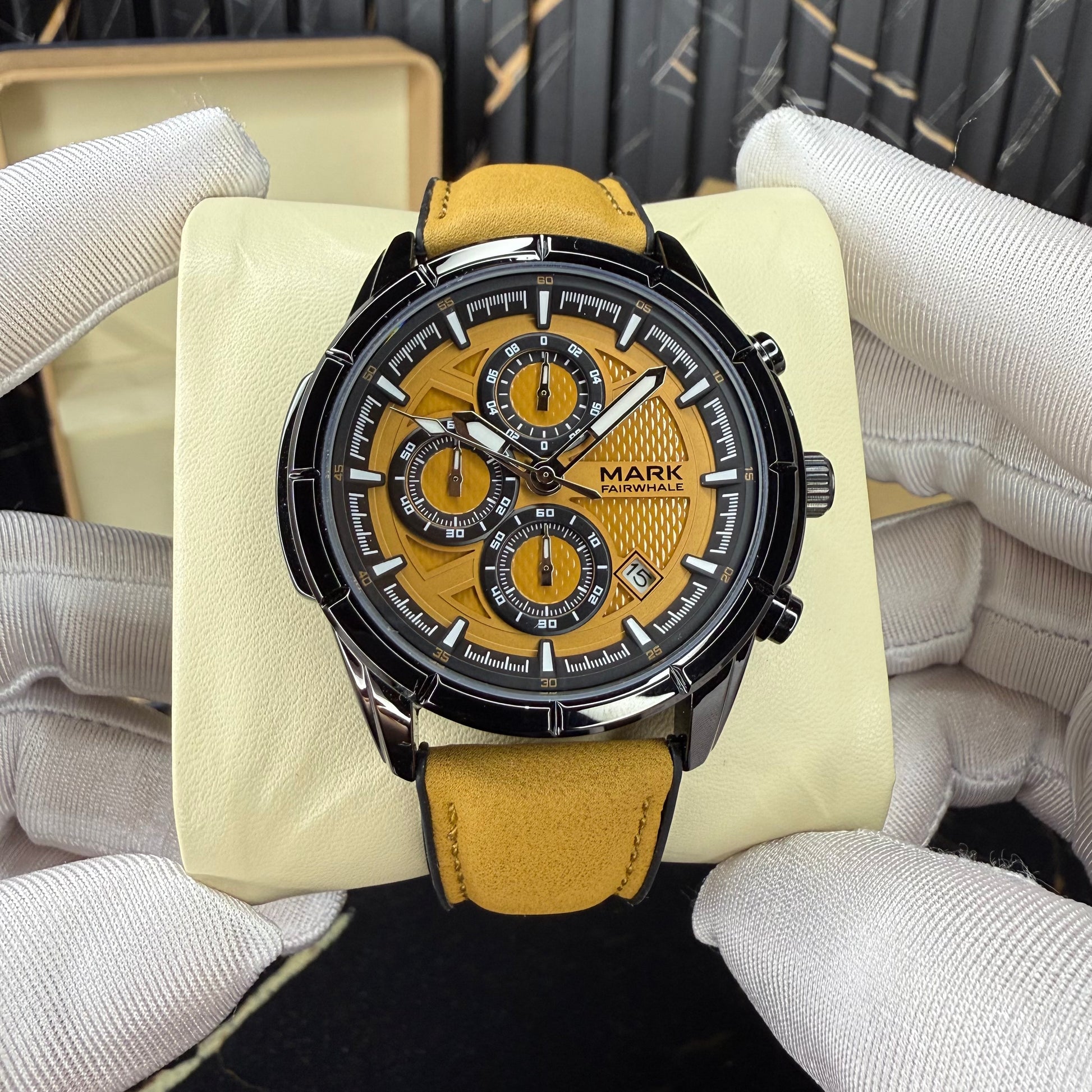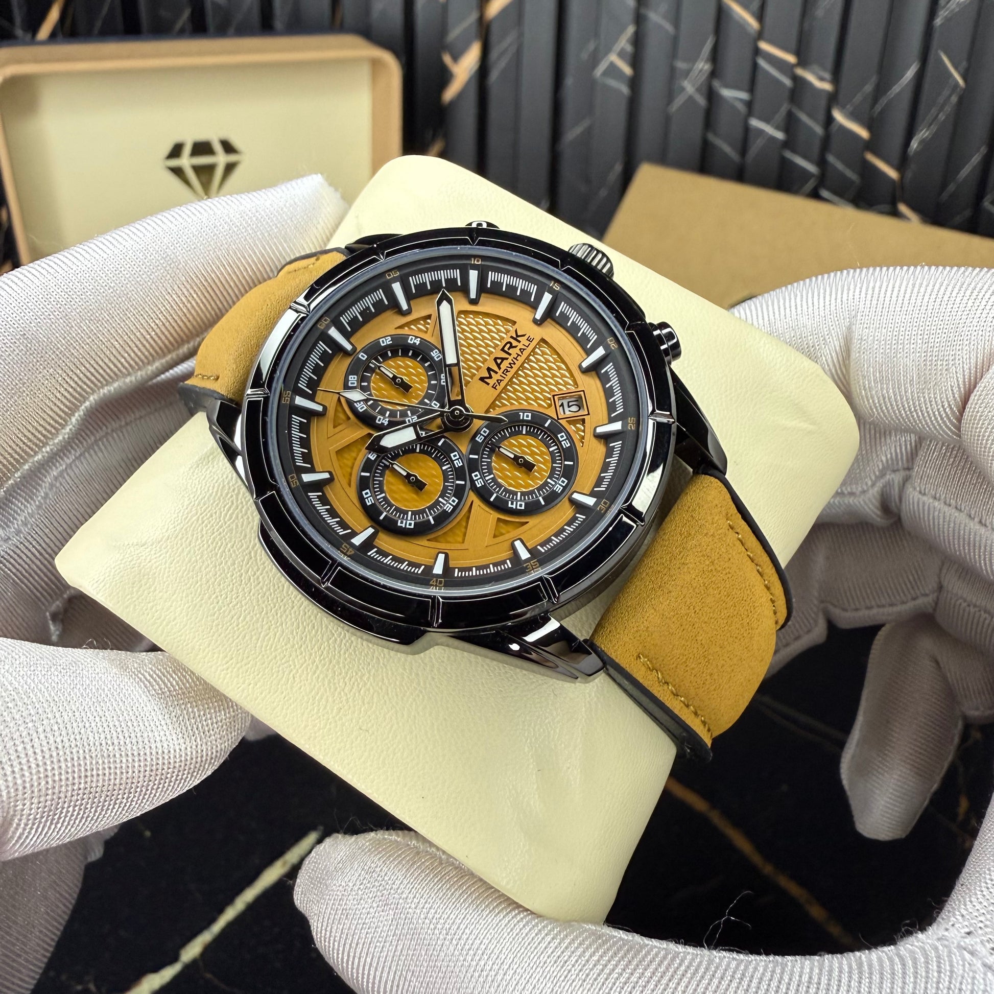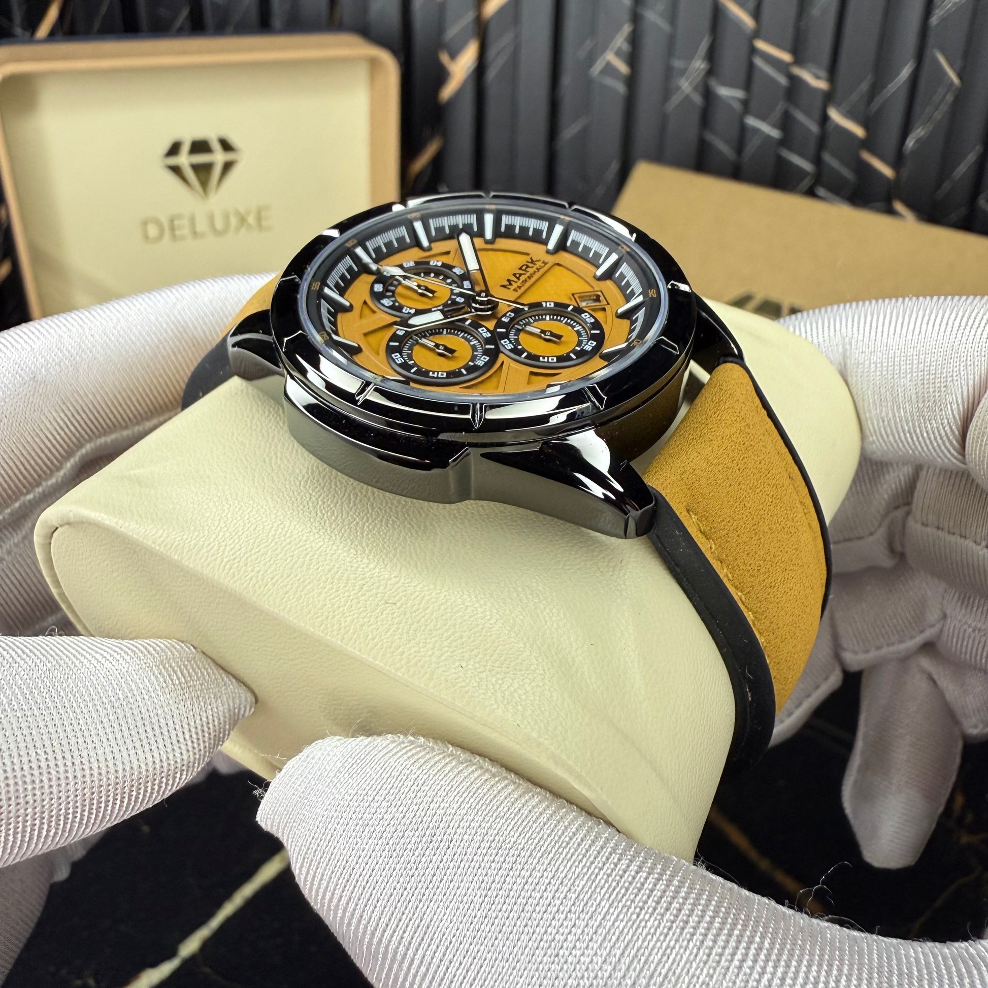 This chronograph stands out through its refined balance of texture, contrast, and depth. The warm mustard dial is layered with sculpted patterns that catch the light from every angle, while the recessed sub-dials add a sense of precision and dimension. Polished hands and crisp indices bring clarity and elegance, perfectly framed by a glossy black case that enhances the dialβs richness. Finished with a soft suede leather strap in a matching tone, this watch feels bold yet refined β a design where every detail is intentional, and every glance reveals something new.