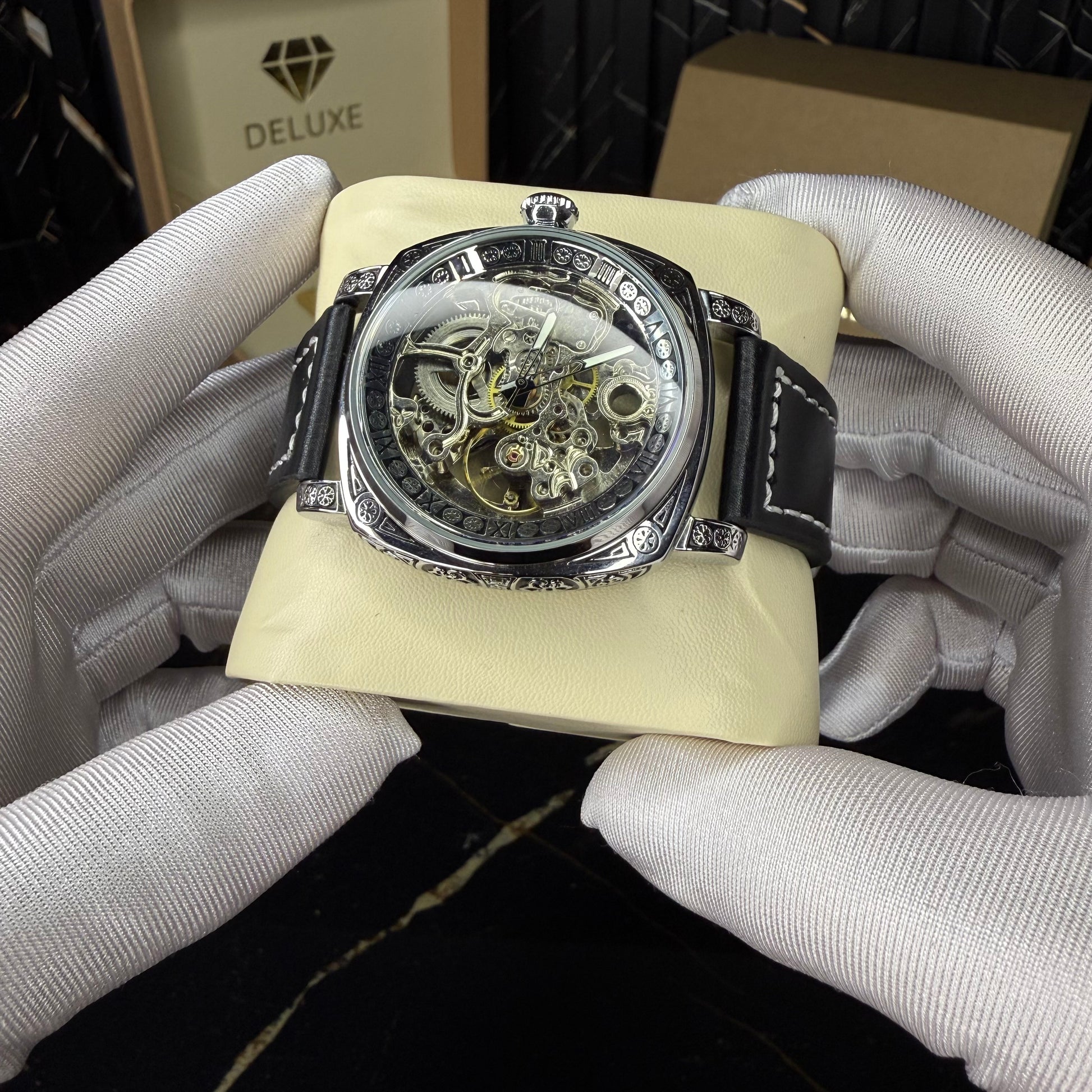 Make a fearless statement with this skeleton watch, revealing every mechanical detail beneath a domed glass. Its engraved silver case and Roman numeral bezel elevate the artistry, while the black leather strap adds a sleek, timeless contrast.