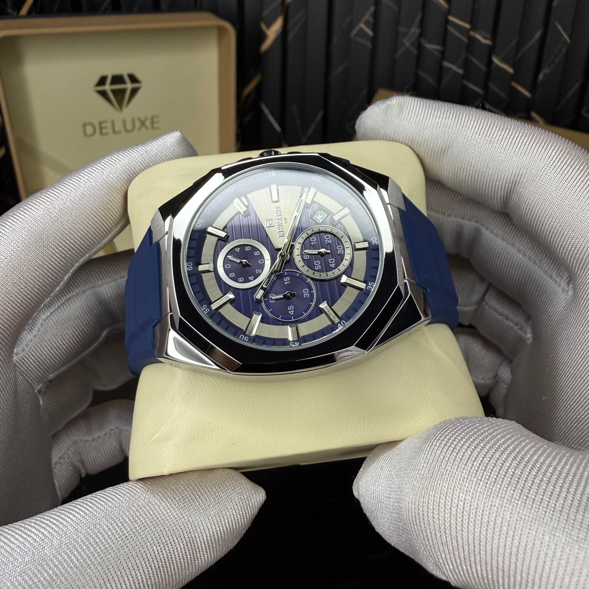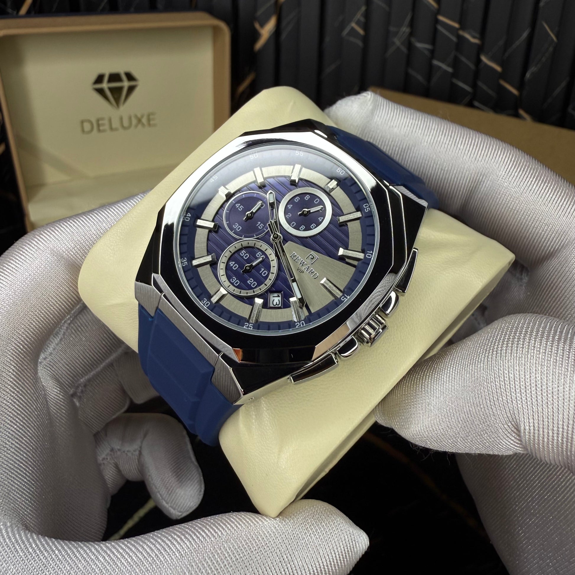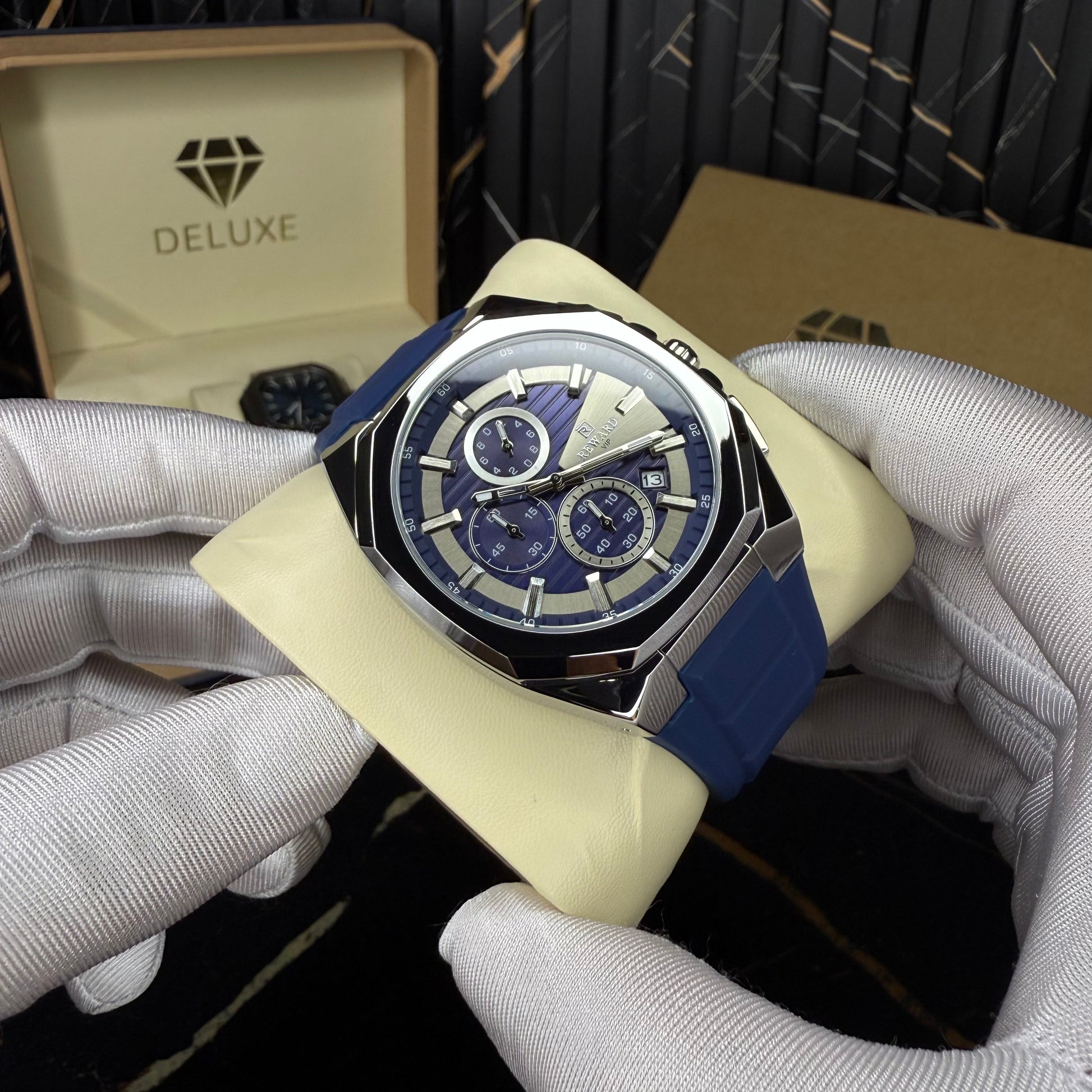 A bold chronograph watch featuring a sculpted case, textured multi-layer dial, and precision sub-dials for a strong, modern presence. Finished with a durable rubber strap for all-day comfort and a confident, sporty look.