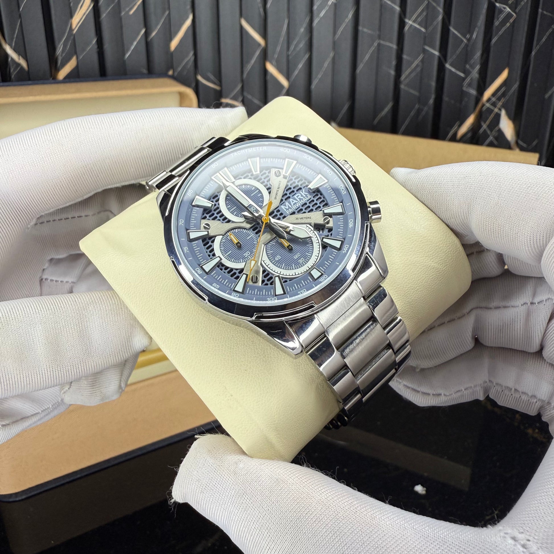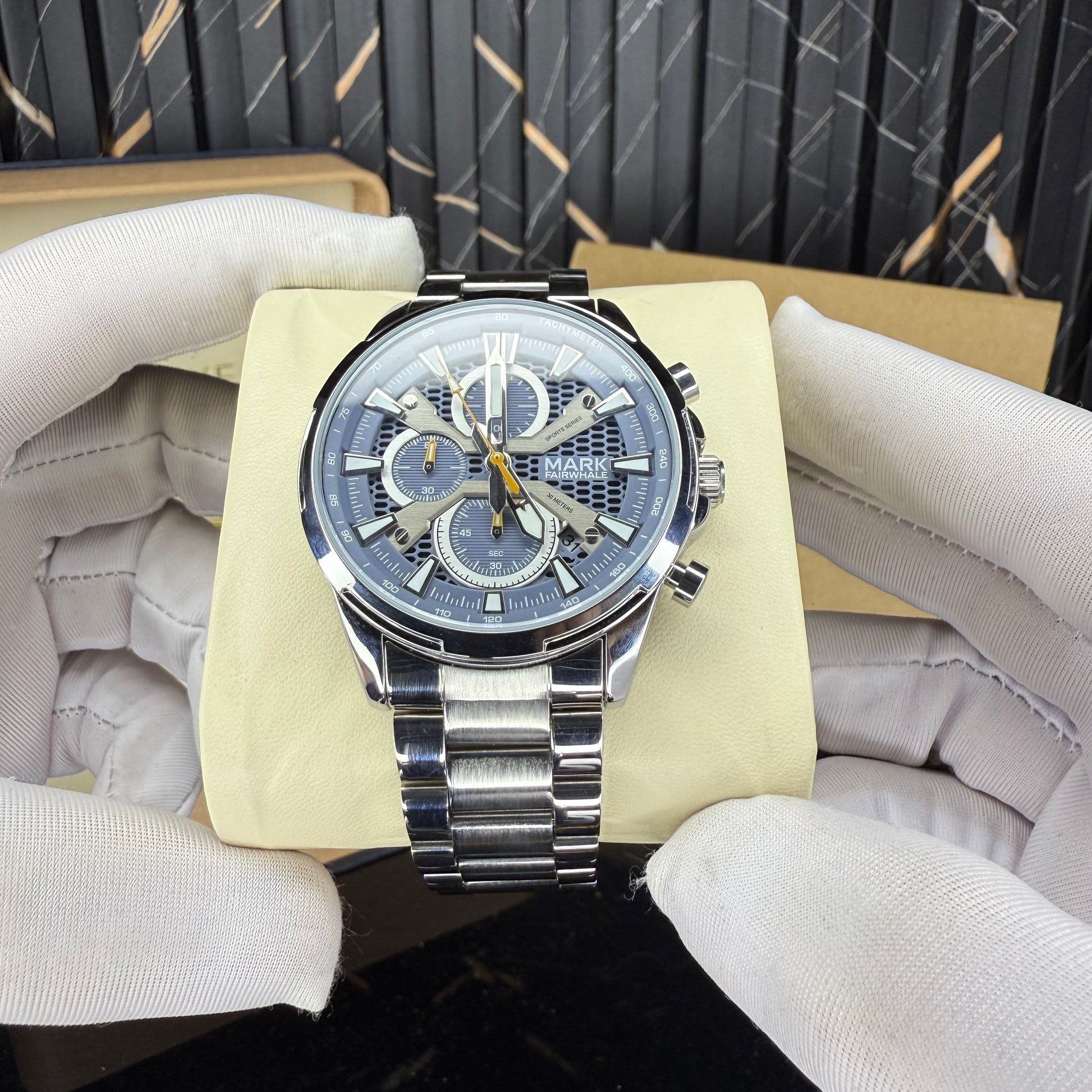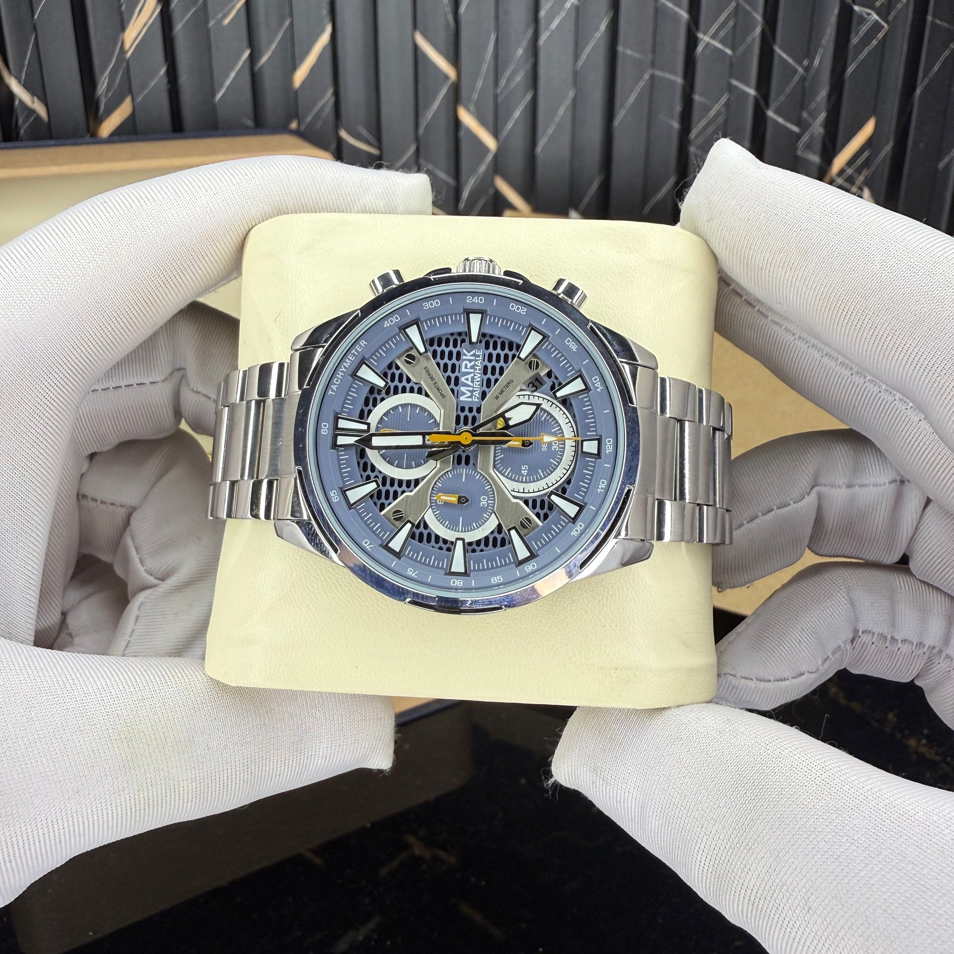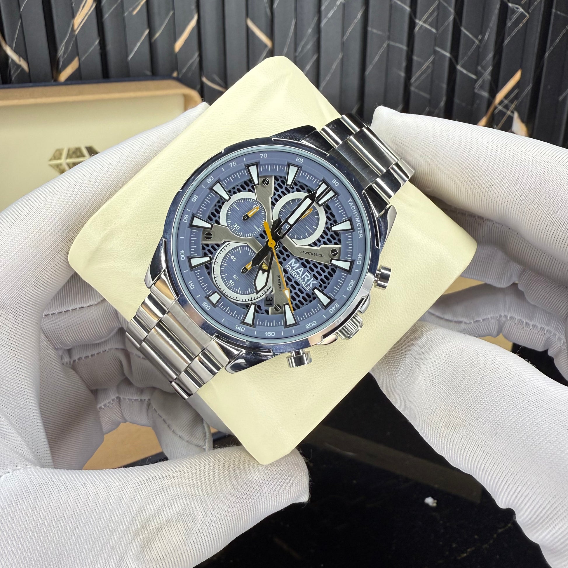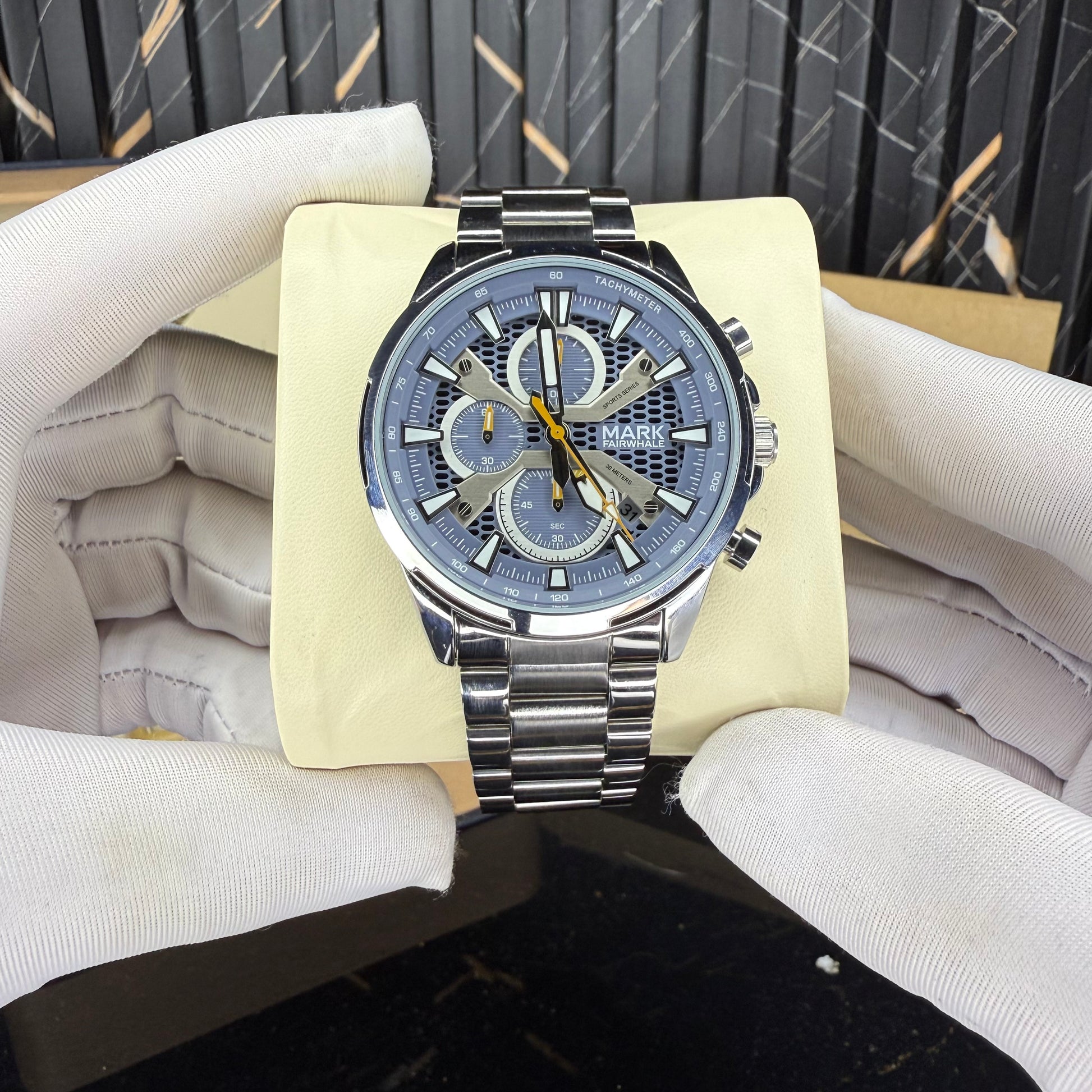 striking combination of sophistication and sport, this chronograph captivates with its unique blue textured dial and luminous accents. The honeycomb pattern underlay, paired with silver indices and yellow highlights, creates a refined yet bold visual balance. Every detail β from the polished bezel to the brushed steel bracelet β speaks of craftsmanship and character.