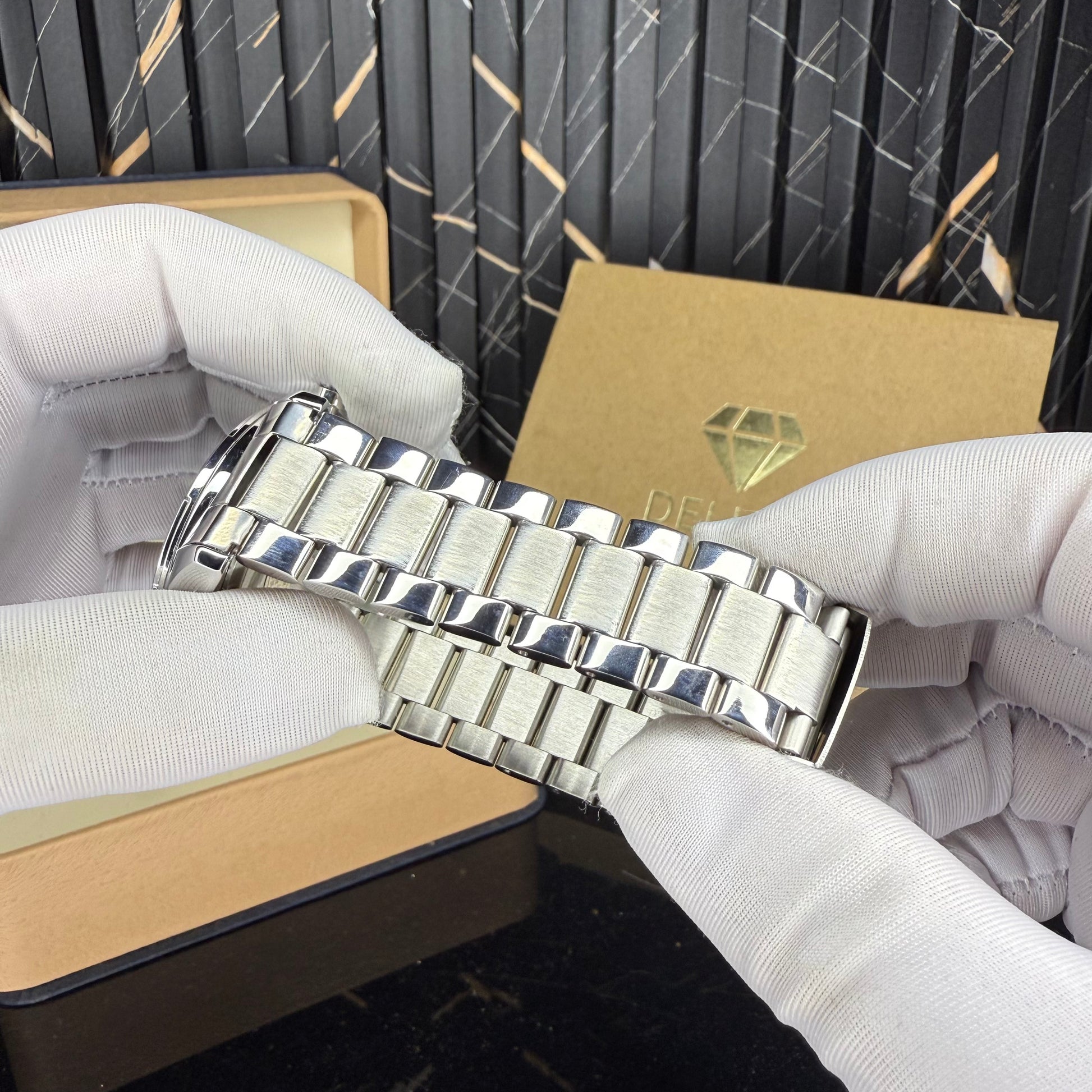 β’ Bracelet: Stainless-steel link design with brushed & polished finish