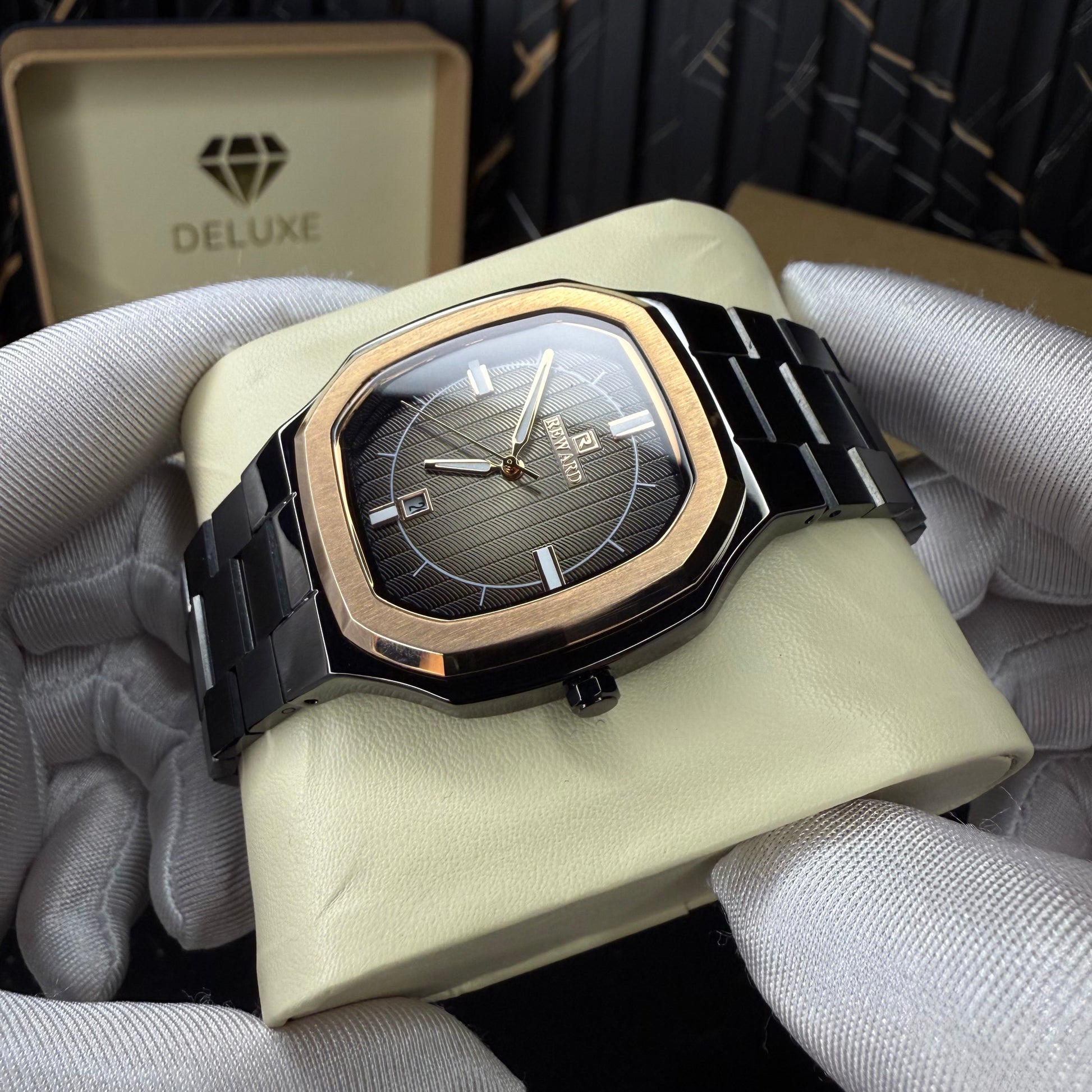 This distinctive timepiece blends architectural design with understated luxury. The octagonal case is framed by a brushed rose-gold bezel, creating a bold contrast against the deep black finish of the case and bracelet. Every angle is sharply defined, giving the watch a strong yet elegant presence on the wrist.