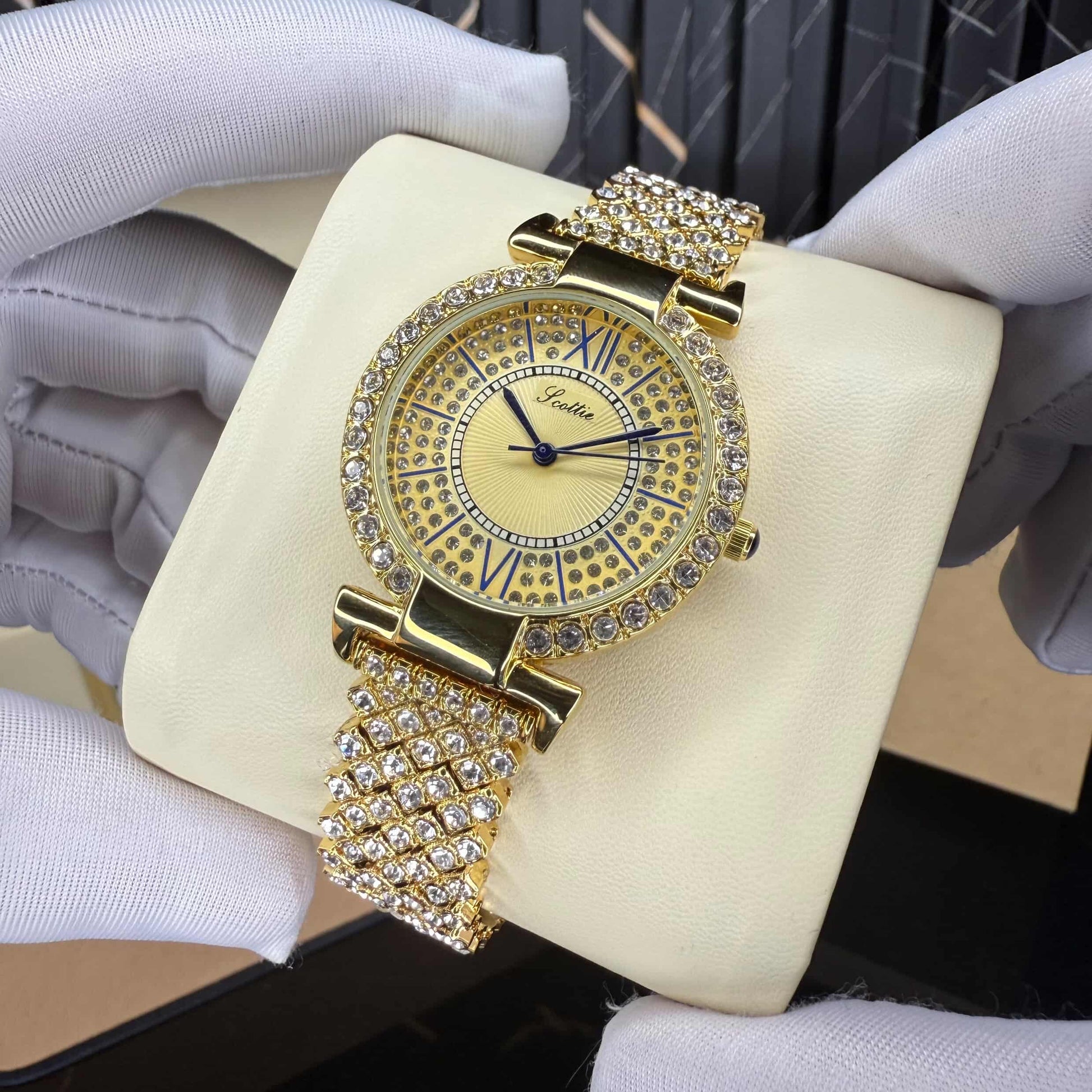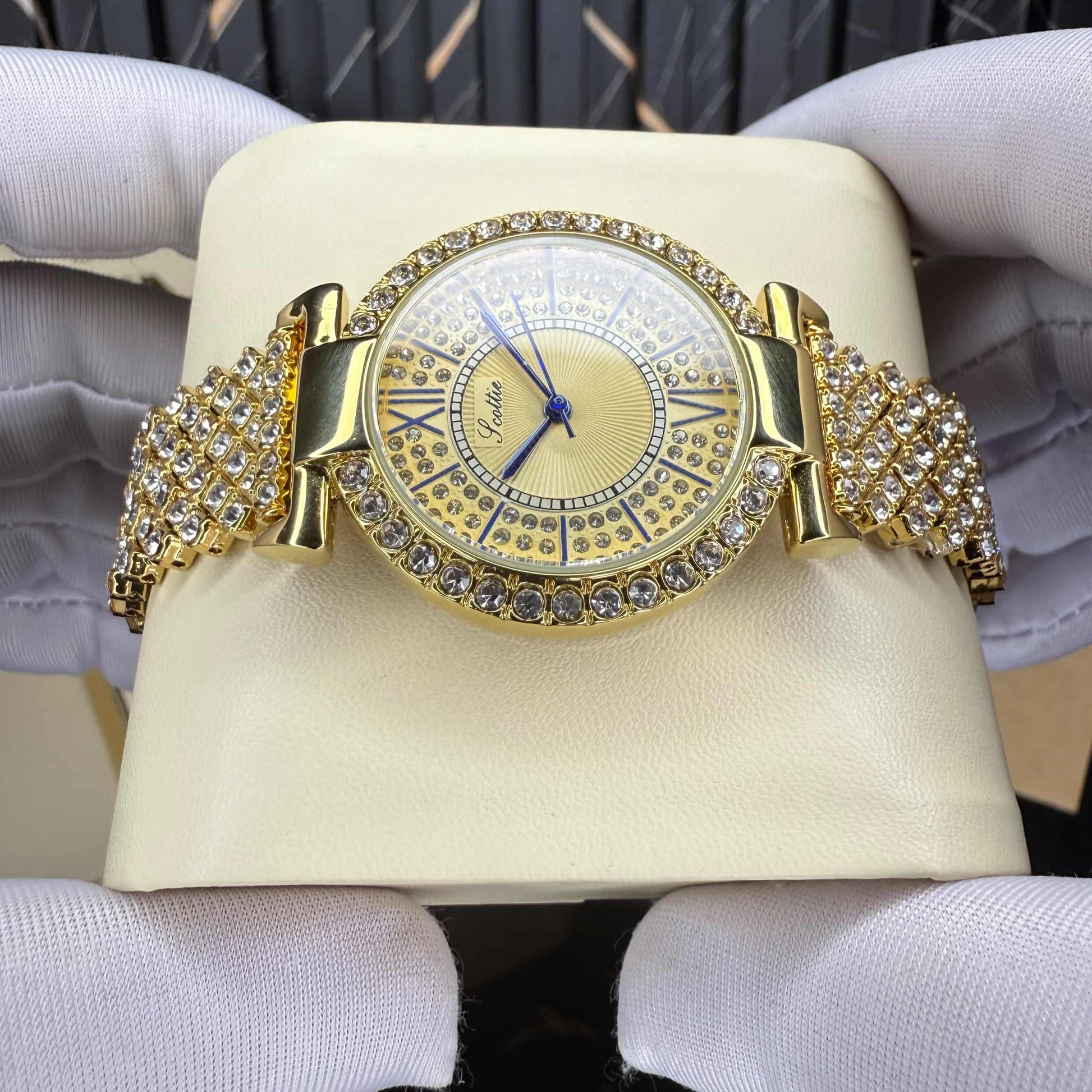 Indulge in pure elegance with this stunning gold-toned watch, crafted for women who love brilliance in every detail. Its dial glows with sunburst texture, while each marker is surrounded by shimmering stones that catch the light from every angle. The bezel is fully encrusted with crystals, creating a luxurious frame around the sleek blue hands that glide gracefully across the face.