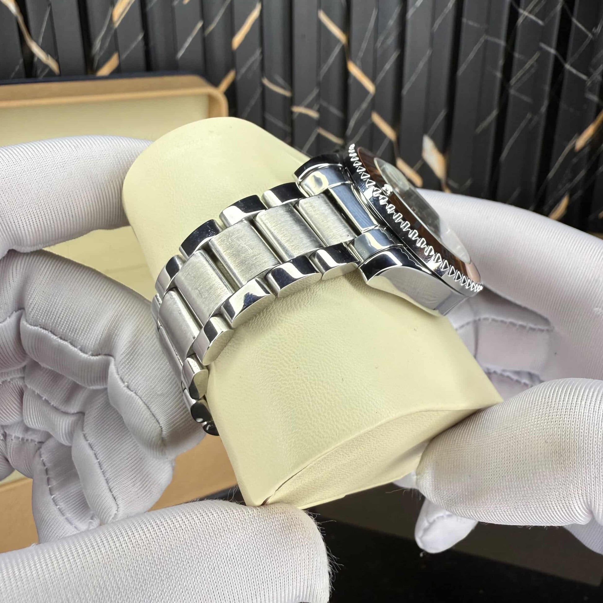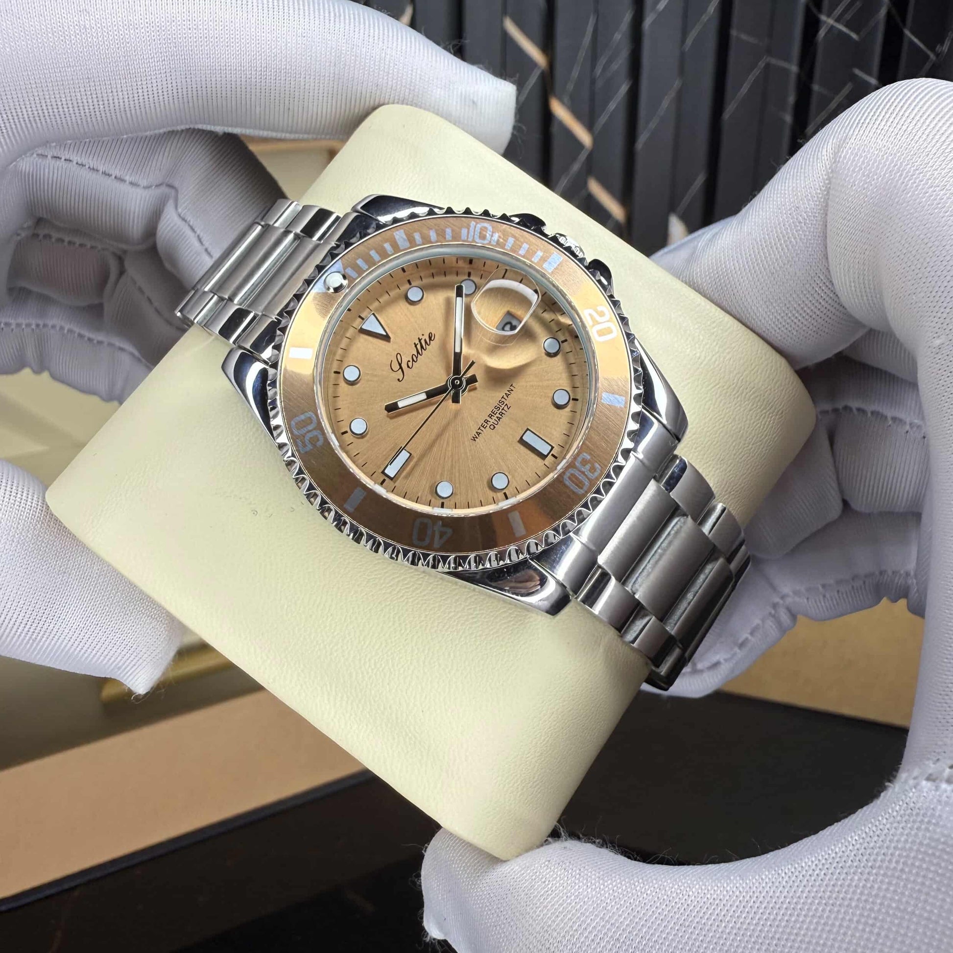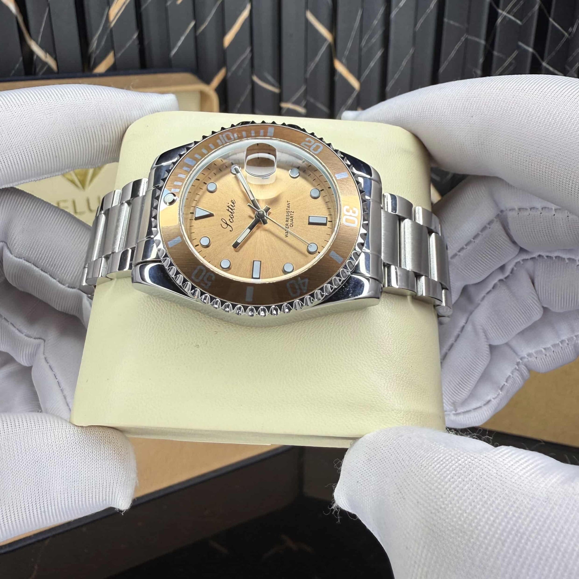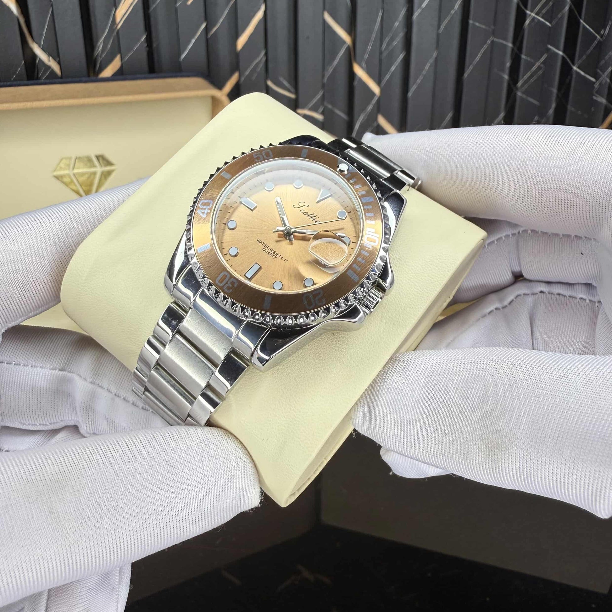 β€’ Gold-accent rotating bezel