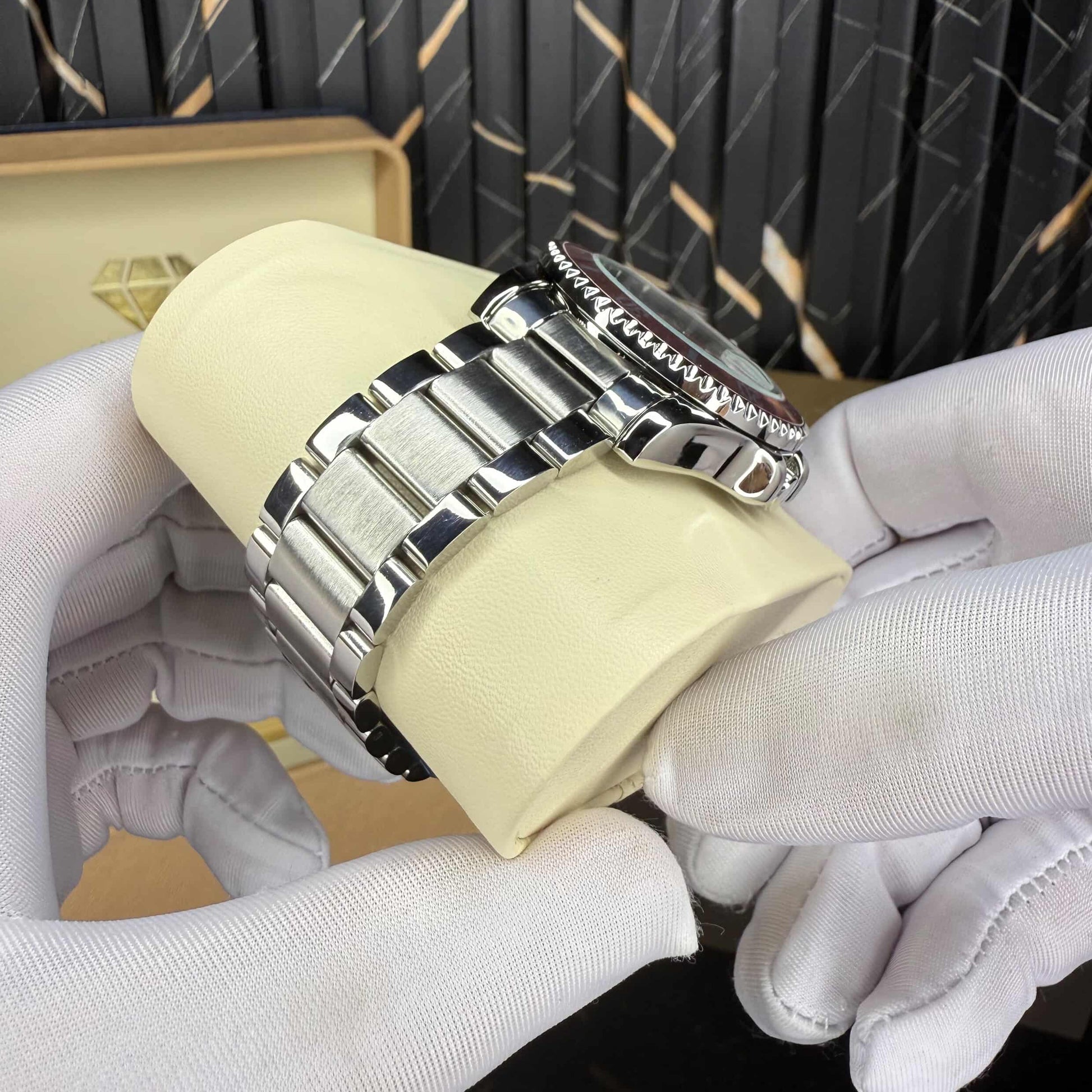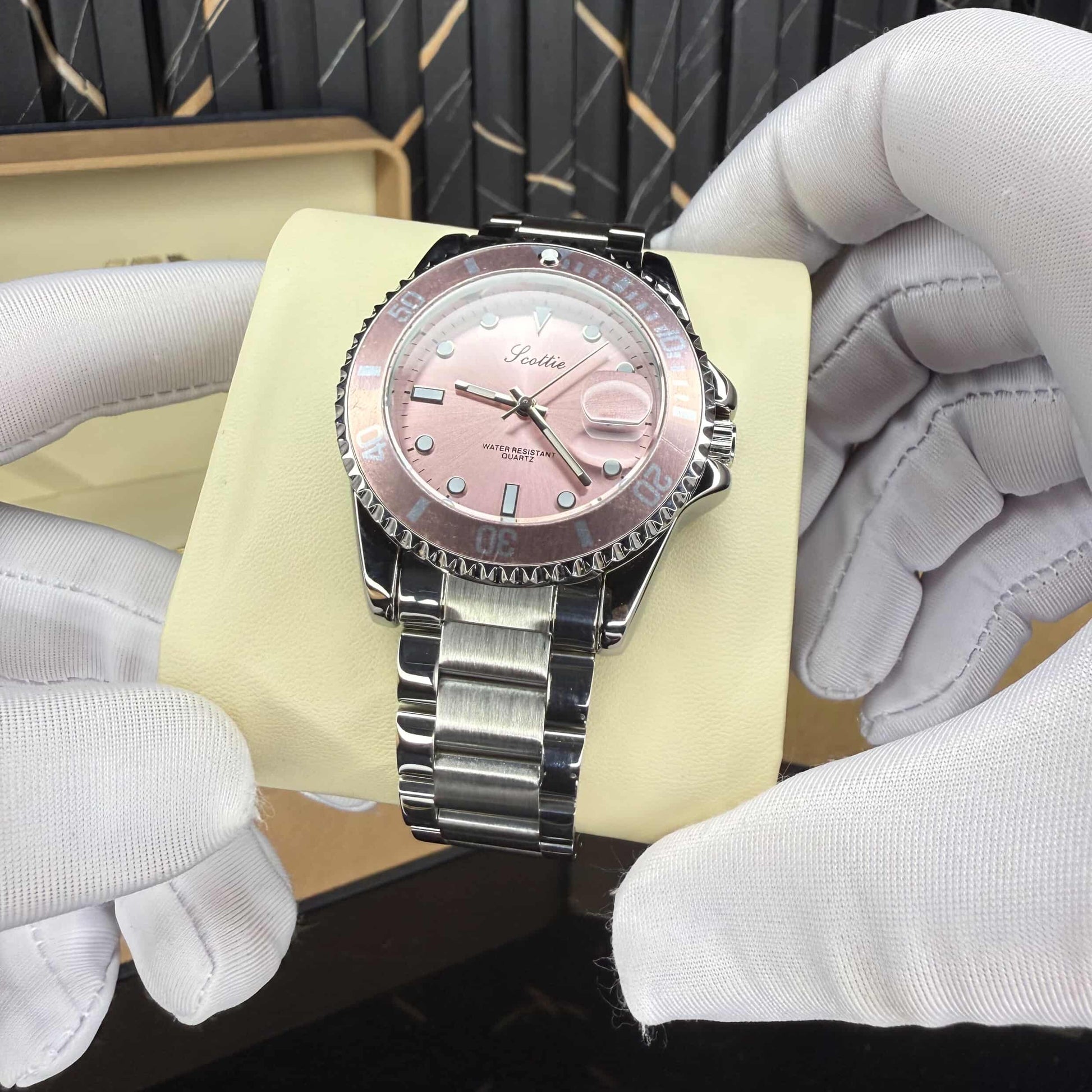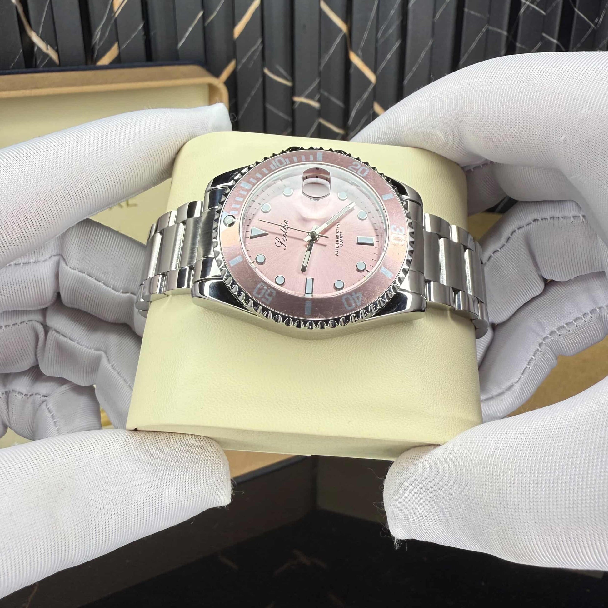 This stunning timepiece blends sporty design with irresistible feminine elegance. The pearl-pink dial glows beautifully under the light, creating a soft, radiant finish that instantly stands out on the wrist. Its rotating bezel in matching pink adds harmony and depth, giving the watch a luxurious presence without losing its modern edge.