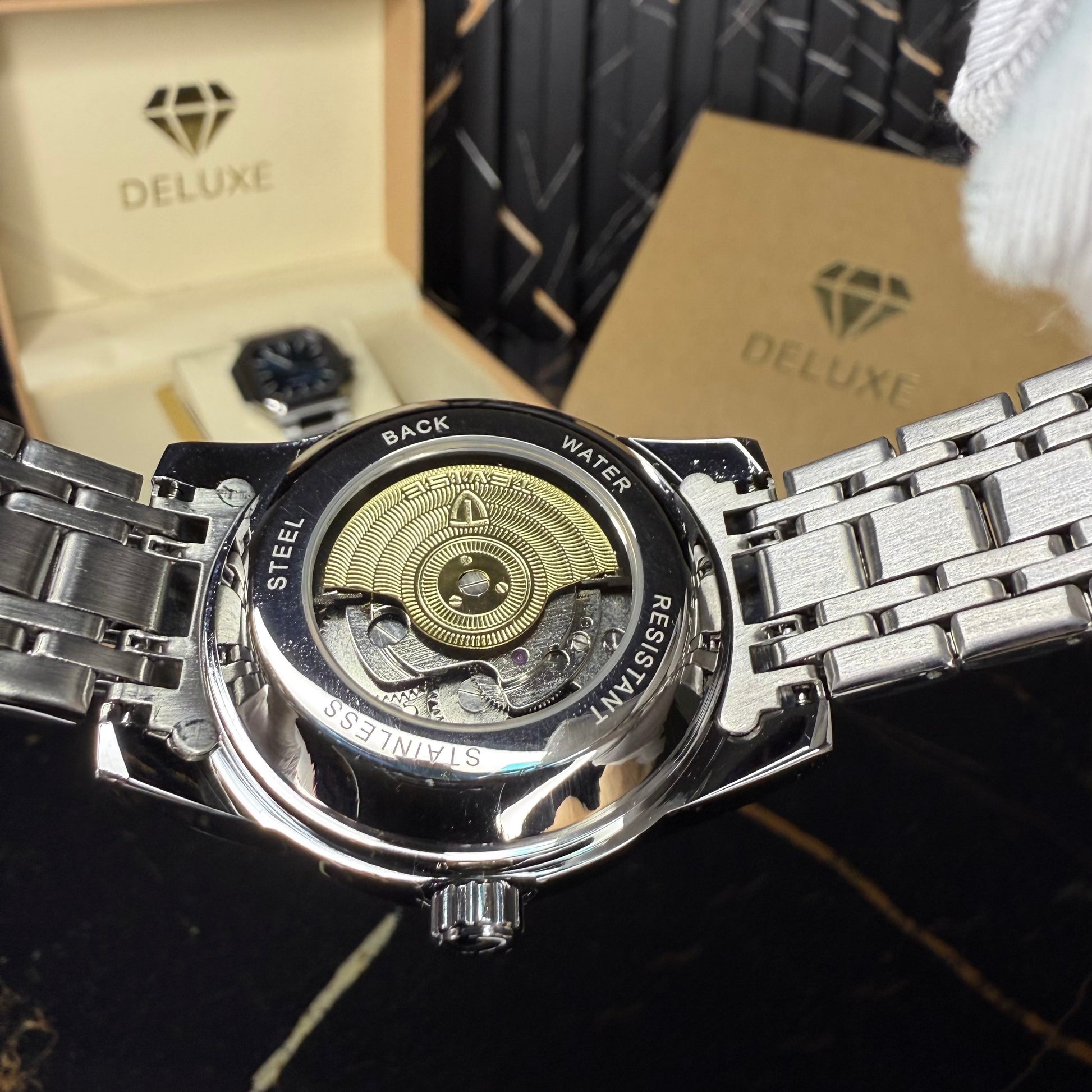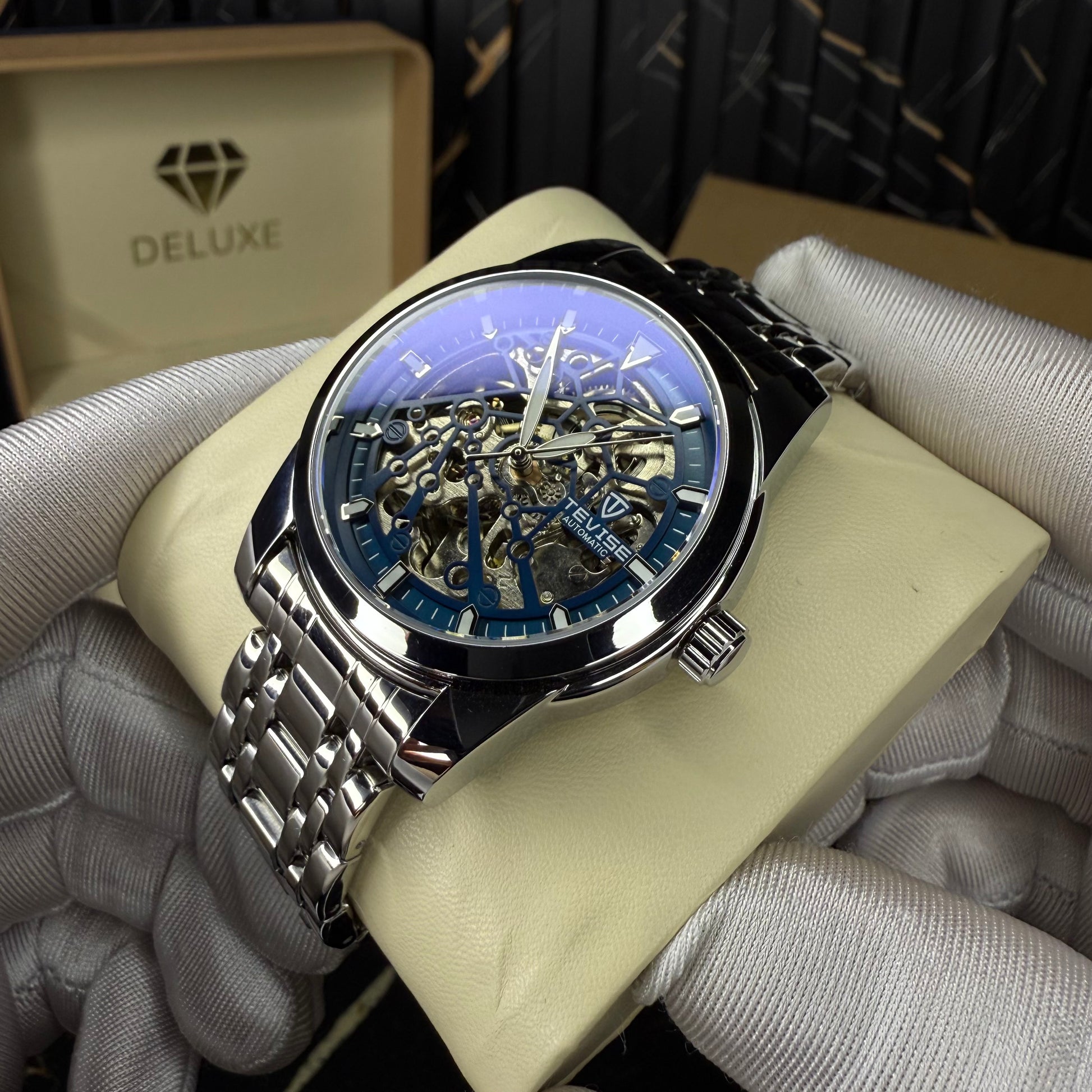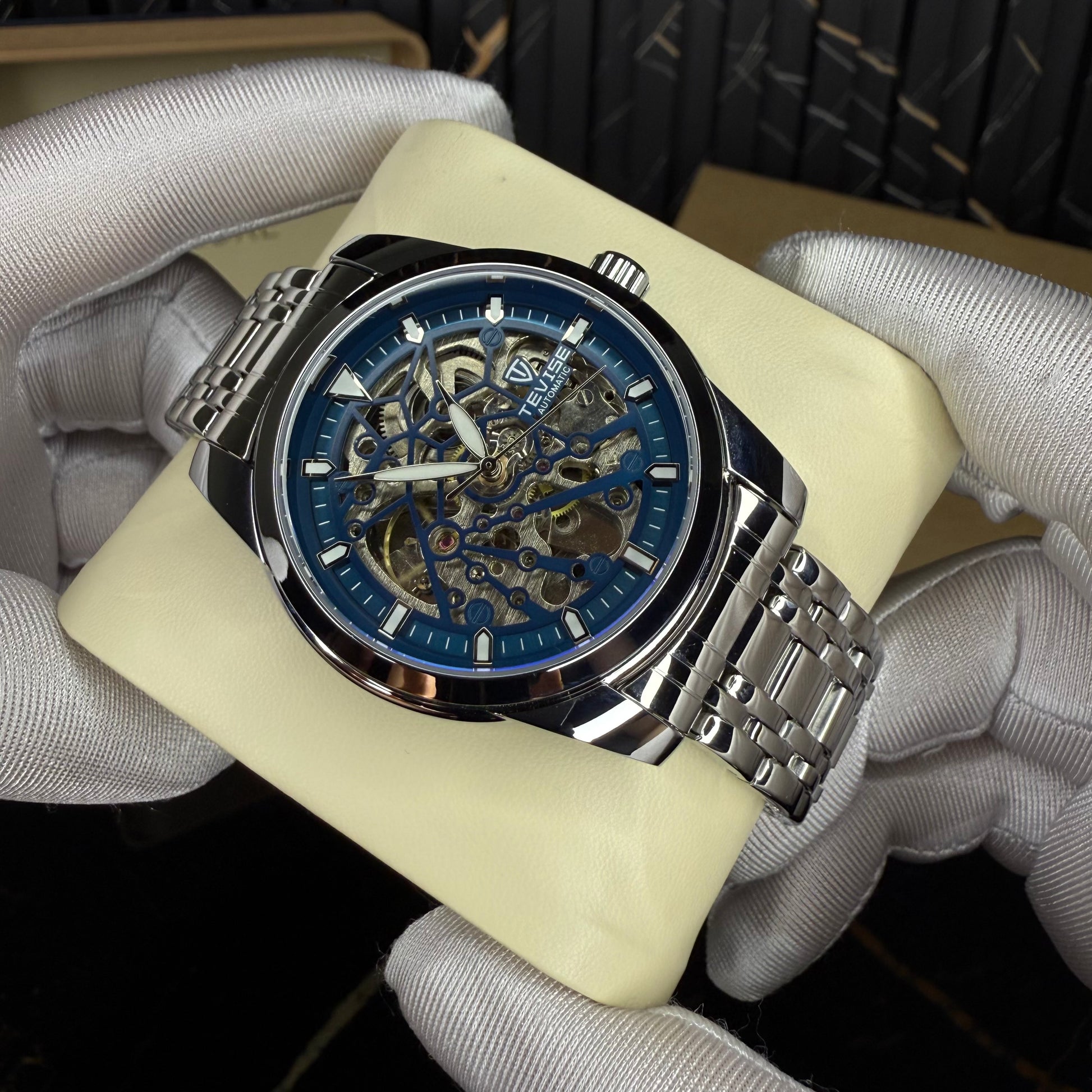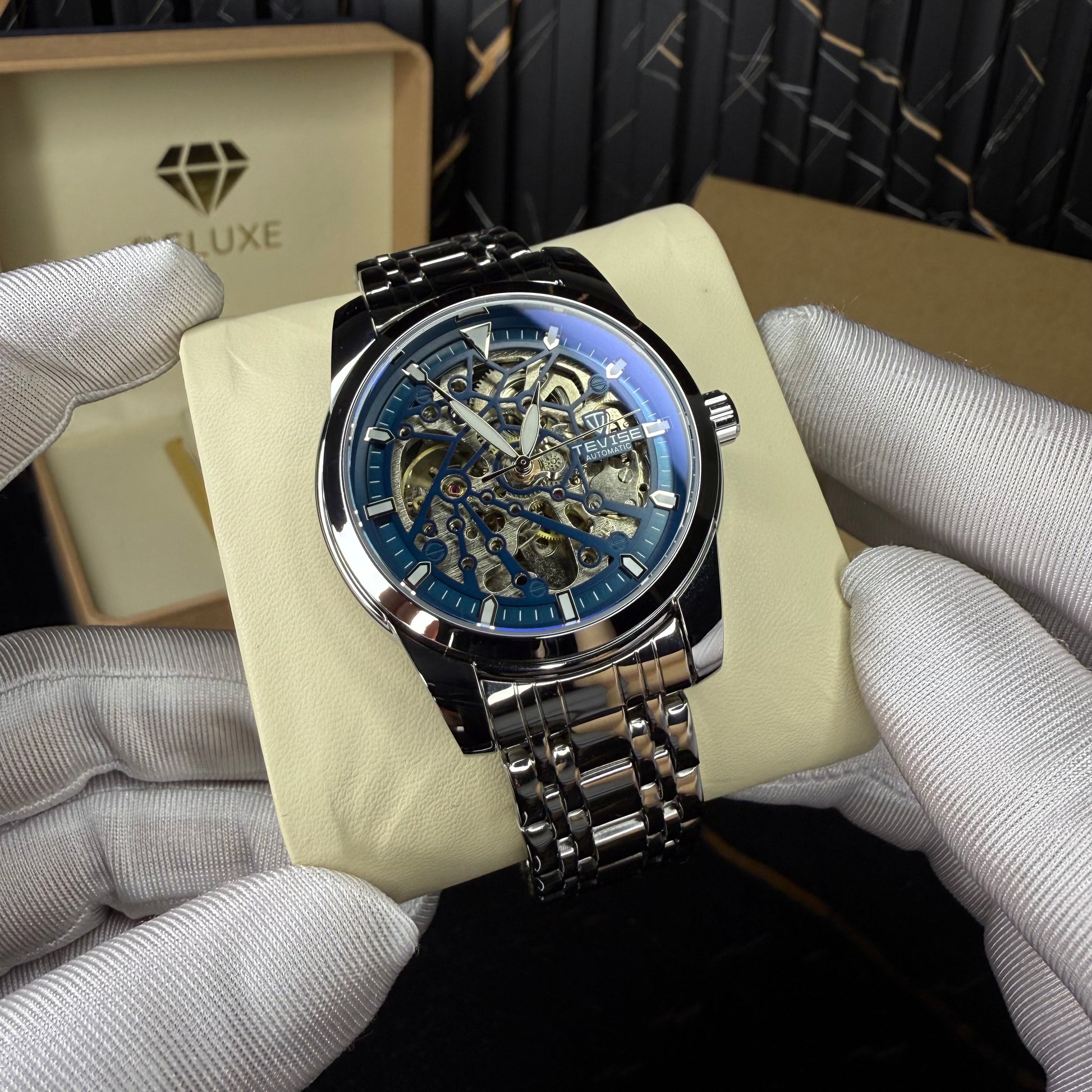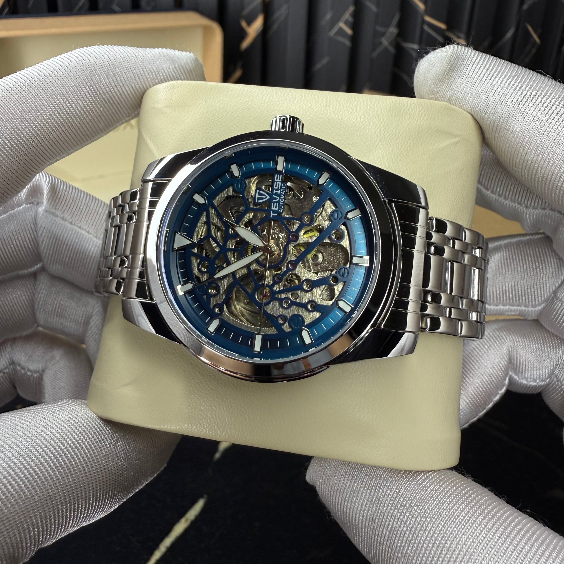 A true masterpiece of mechanical art β this automatic skeleton watch reveals the beauty behind every movement. Its deep blue dial frames a mesmerizing open-heart design, where the visible gears and balance wheel create a constant dance of precision and style. The polished stainless steel bracelet completes its refined look, catching light with every motion.