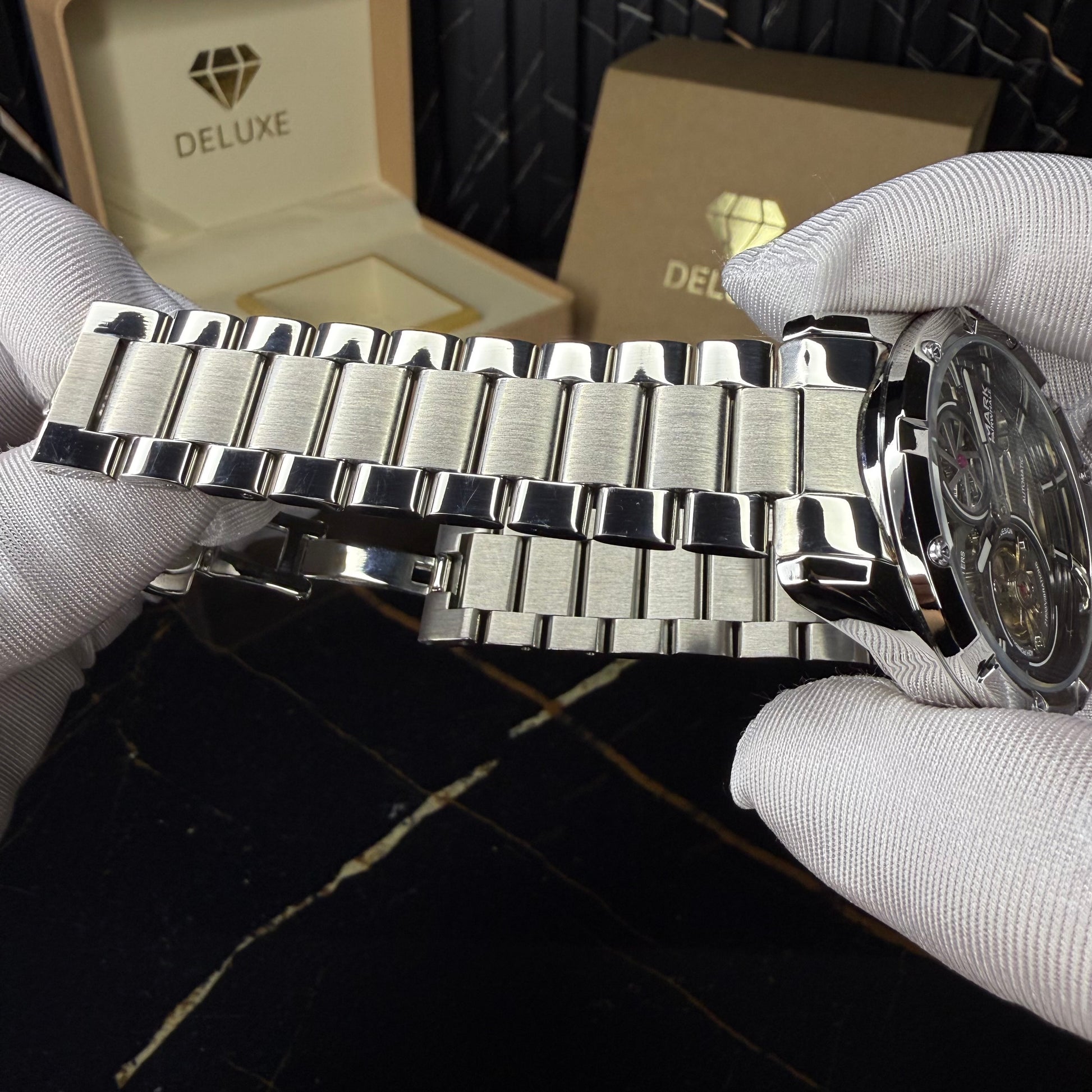 From the polished steel case to the sculpted bezel screws, every detail is crafted to deliver presence. The dual-aperture design highlights the 24-hour power reserve wheel and the rotating balance system, adding depth, motion, and undeniable character. Paired with a solid stainless-steel bracelet, the watch feels as premium as it looks.