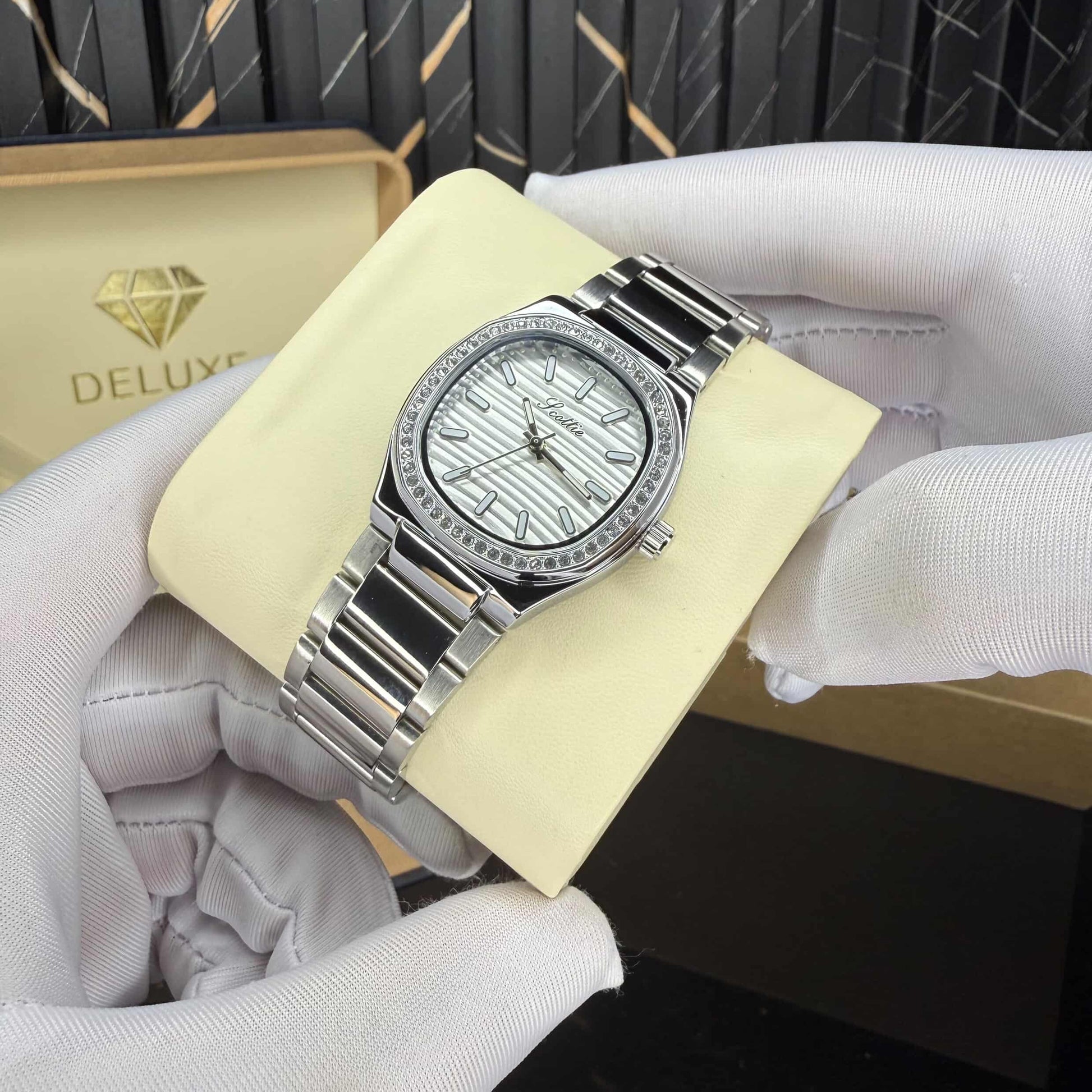 This stunning timepiece blends modern luxury with a clean, luminous aesthetic. Its silver-white textured dial creates a soft, flowing shimmer that catches the light with every movement, while the crystal-lined bezel adds a subtle halo of sparkleโgraceful, feminine, and effortlessly chic.