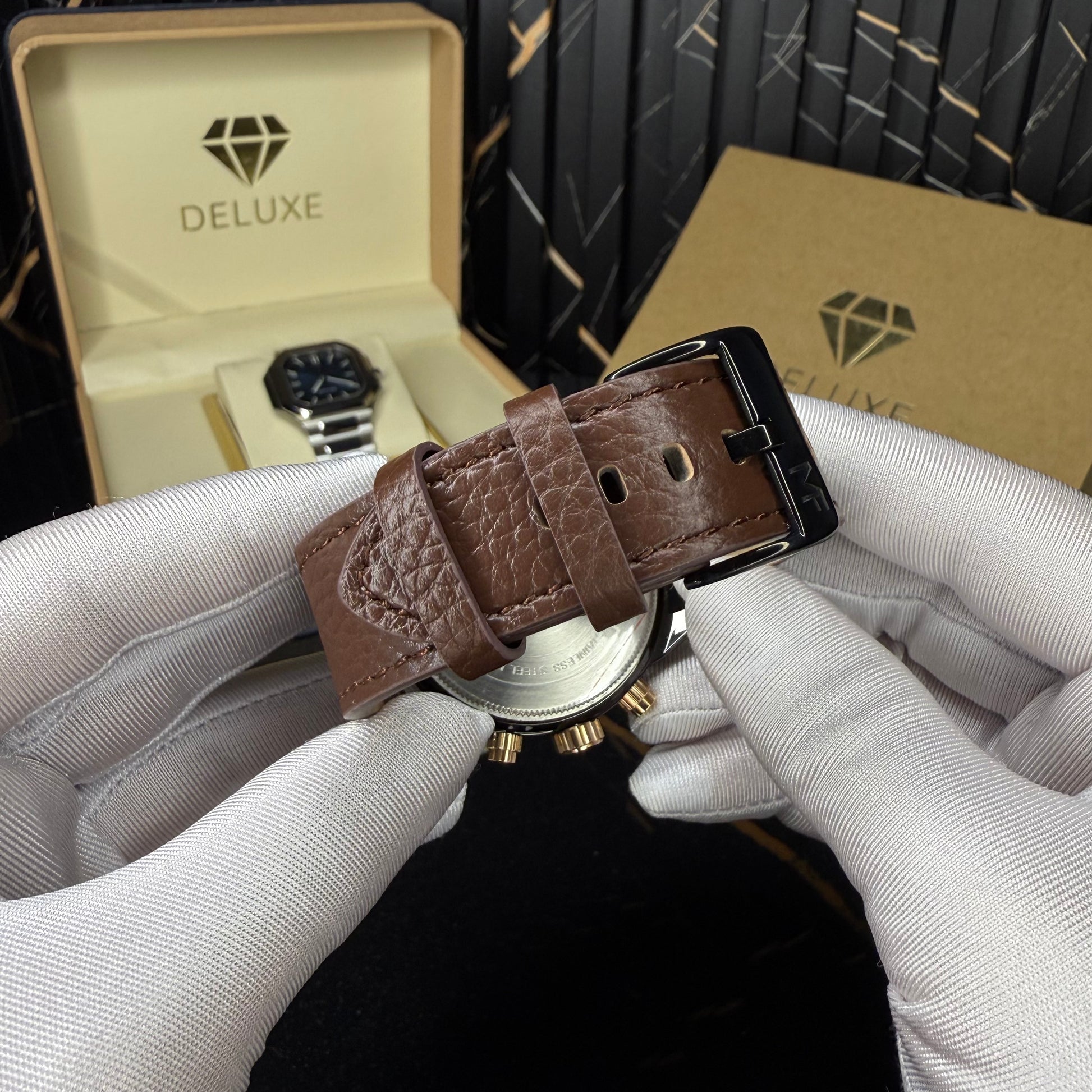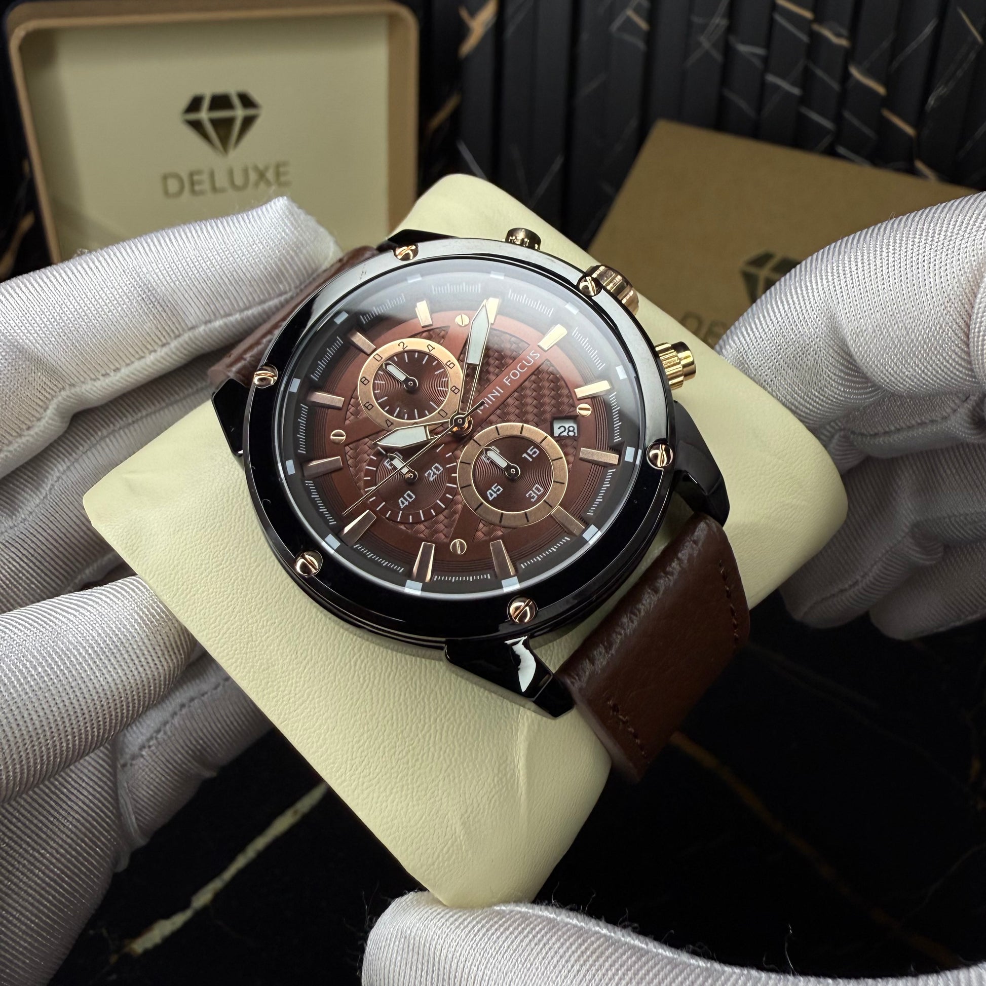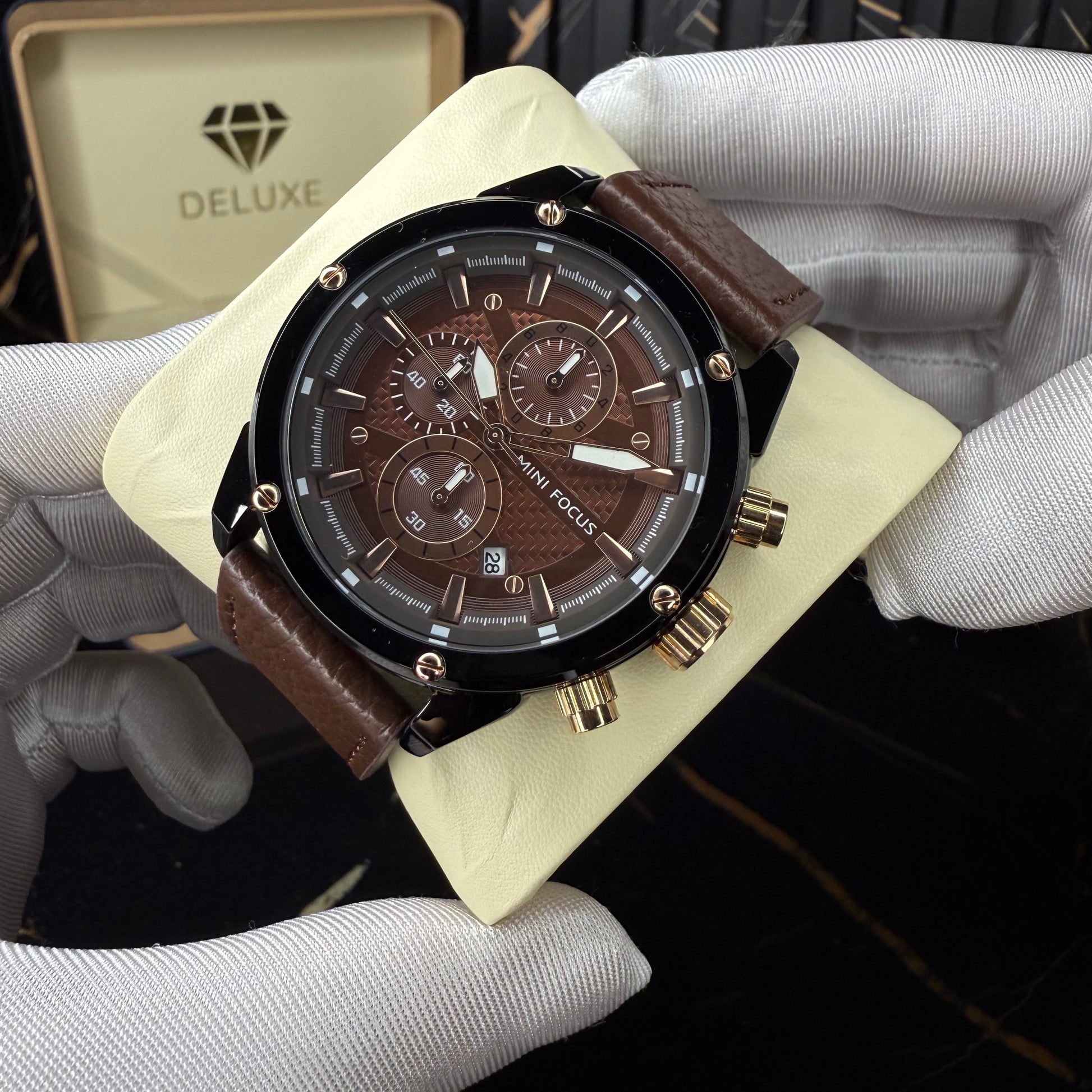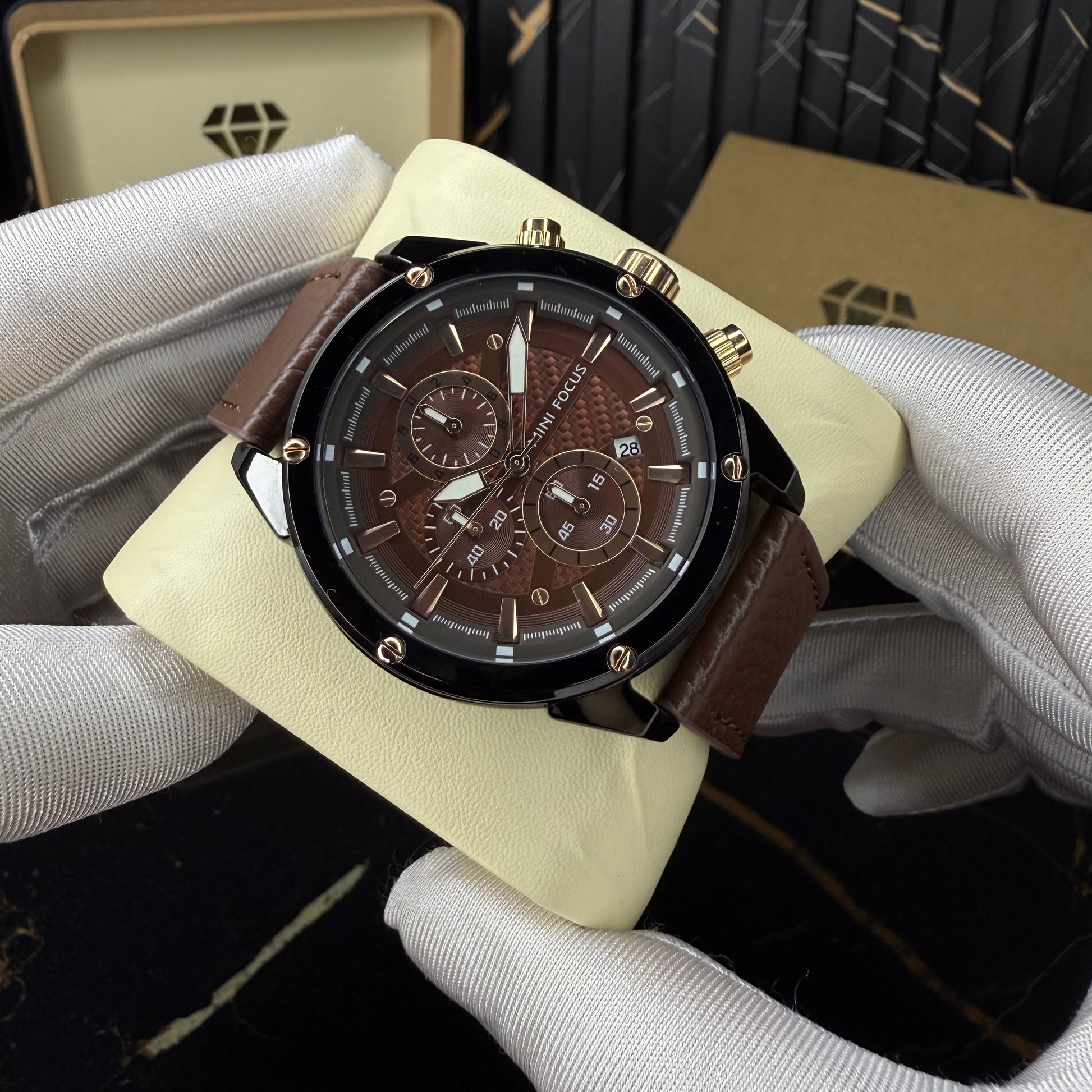This chronograph stands out through its refined balance of texture, depth, and contrast. The richly detailed dial features layered finishes and precisely placed sub-dials, creating a sense of depth that draws the eye from every angle. Polished hour markers and bold hands enhance readability while adding a sharp, confident character. The glossy black case is accented with gold-tone pushers and screws, delivering a subtle yet powerful contrast, while the supple brown leather strap completes the design with warmth and sophistication. Every element is carefully crafted to feel intentional, making this watch a statement of detail-driven elegance built for everyday wear.