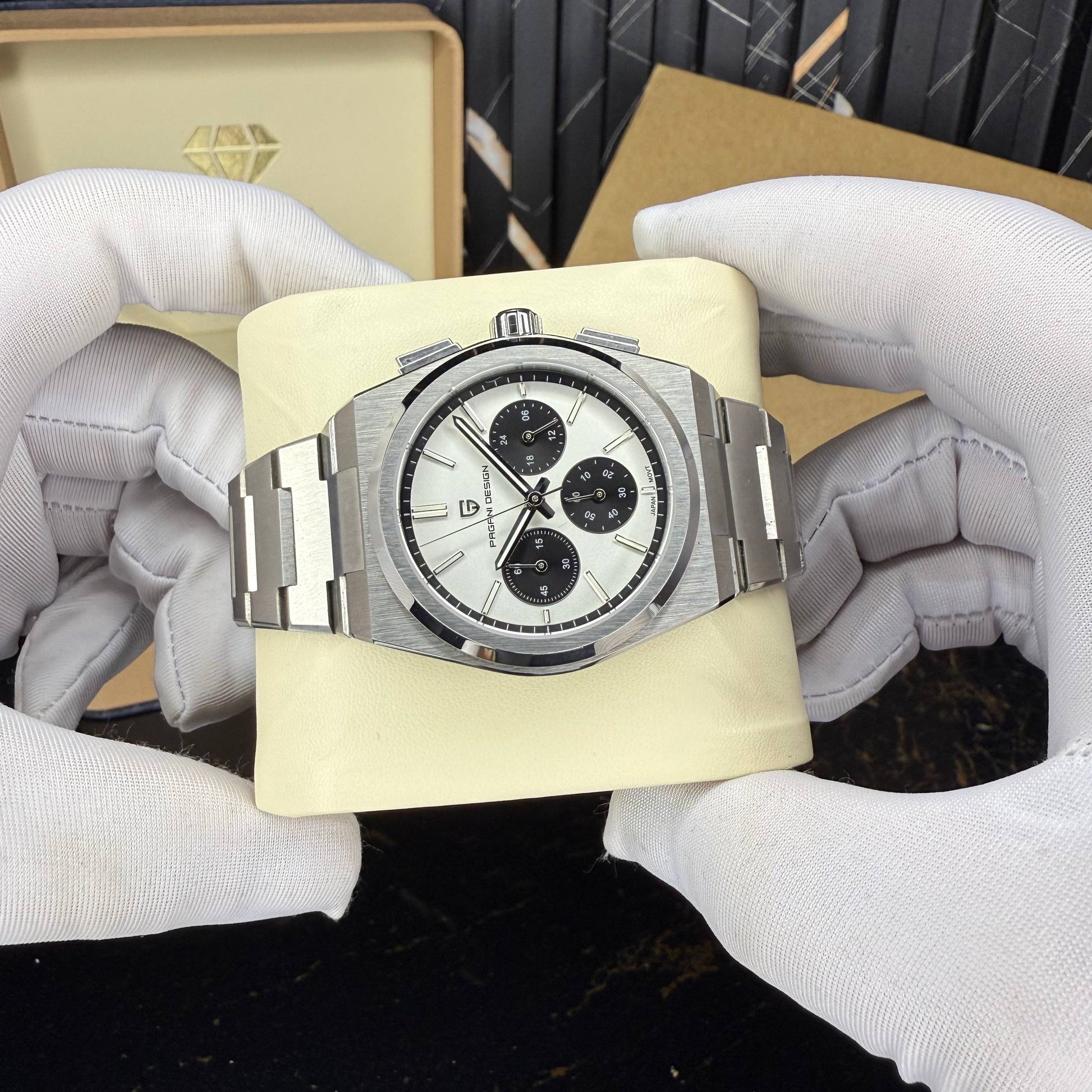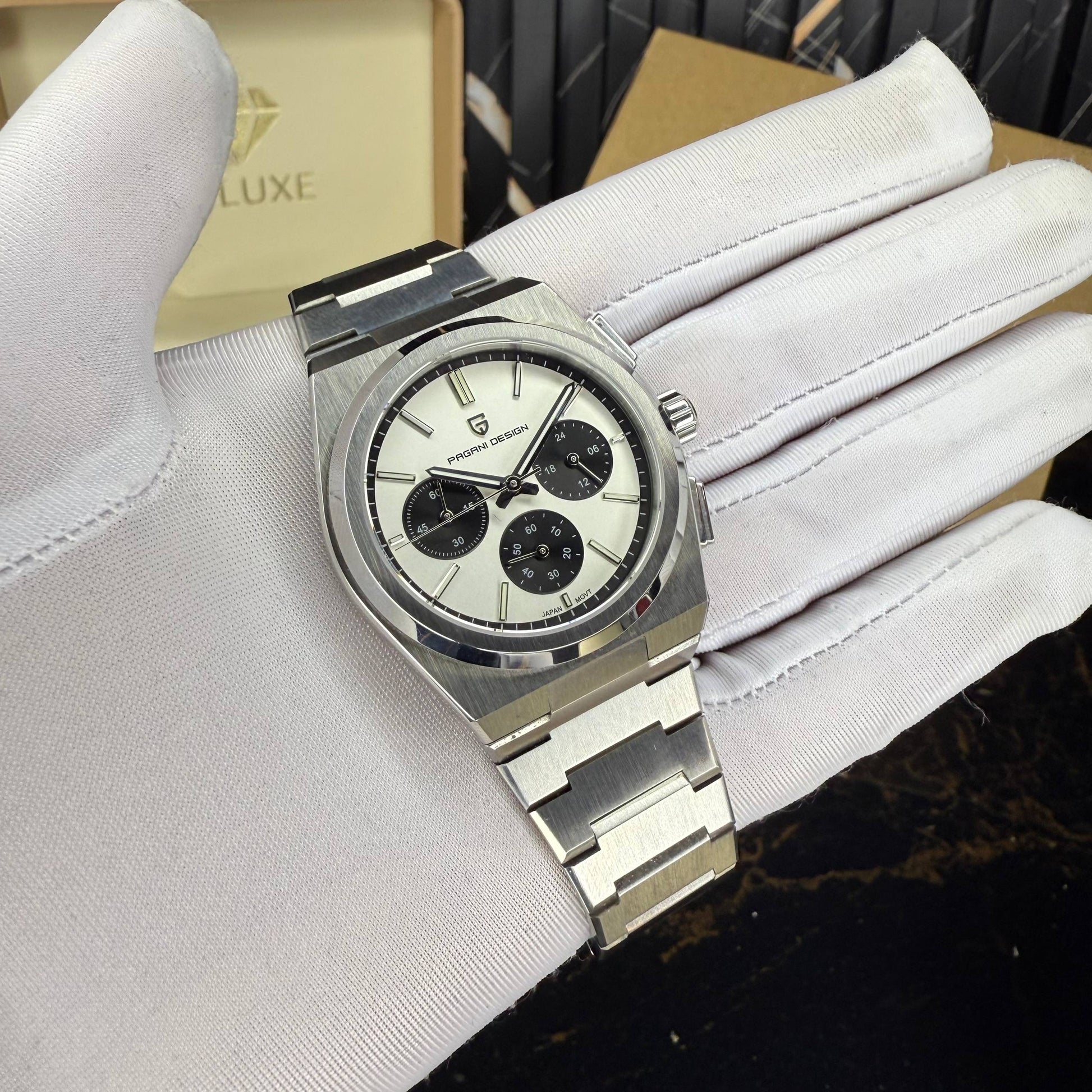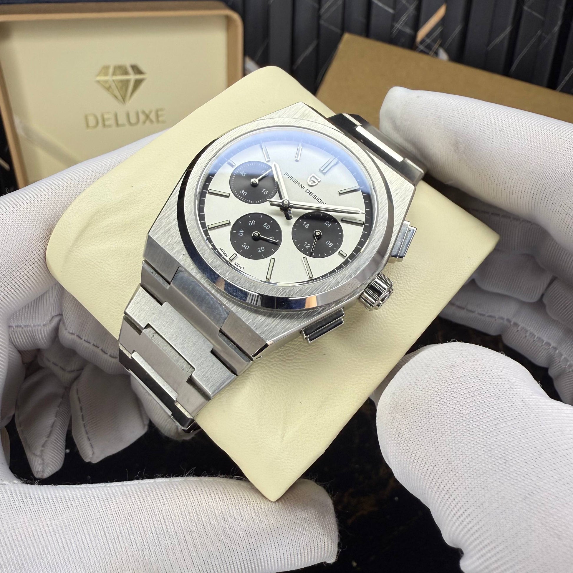 Experience the perfect balance between bold design and everyday performance with this stainless-steel chronograph. Built for men who value precision and presence, this timepiece features a clean white dial contrasted by three deep-black subdials—delivering a striking “panda” aesthetic that watch enthusiasts love.