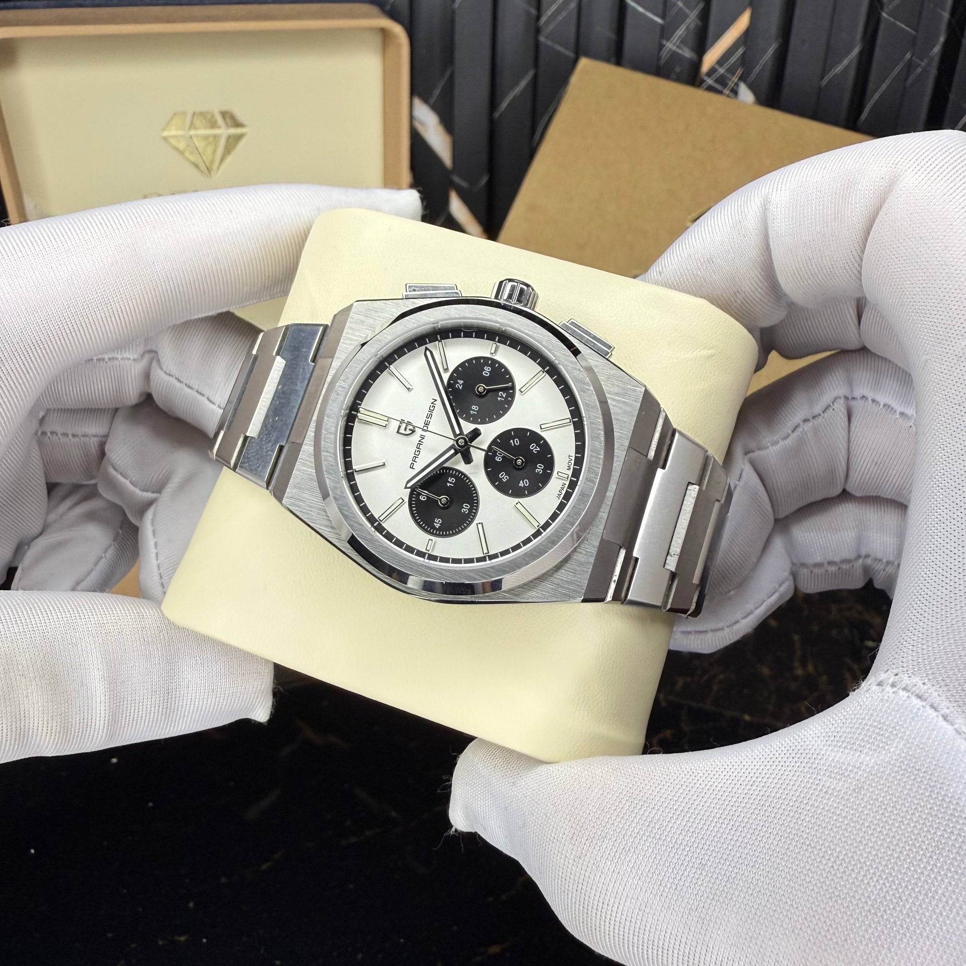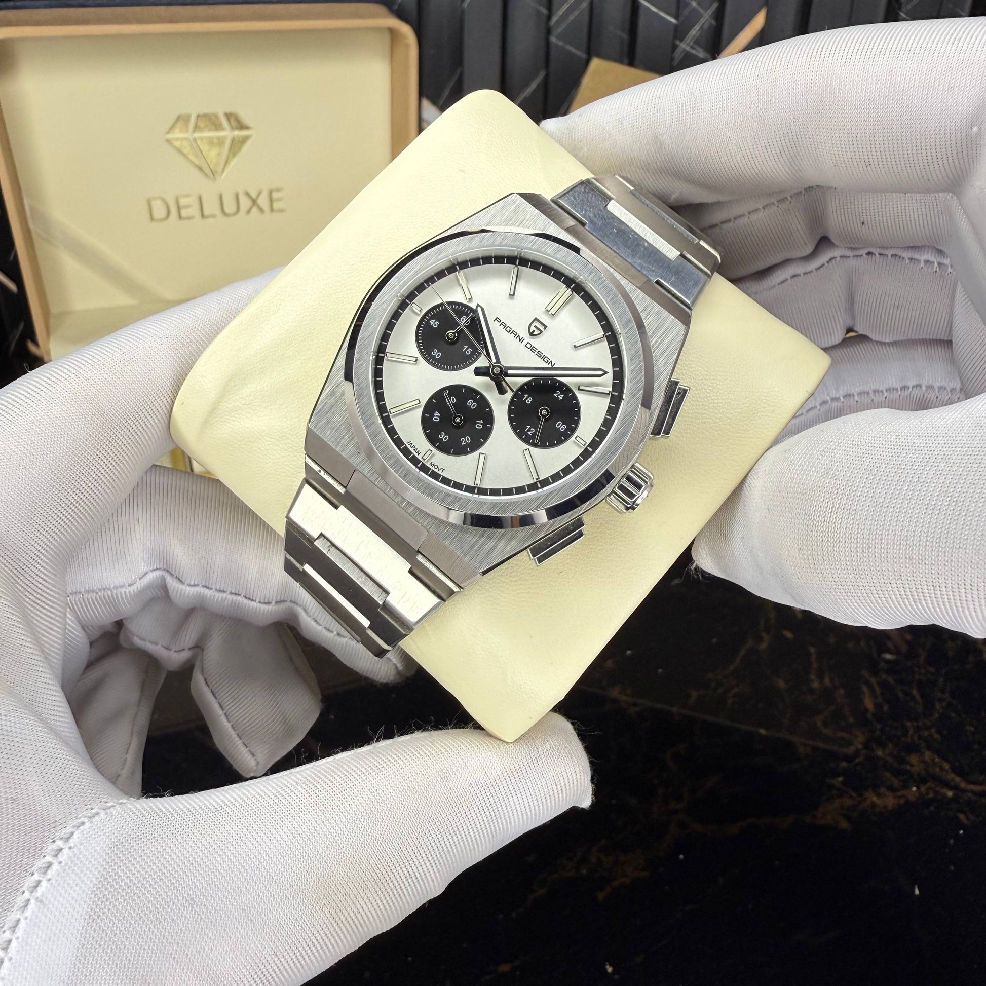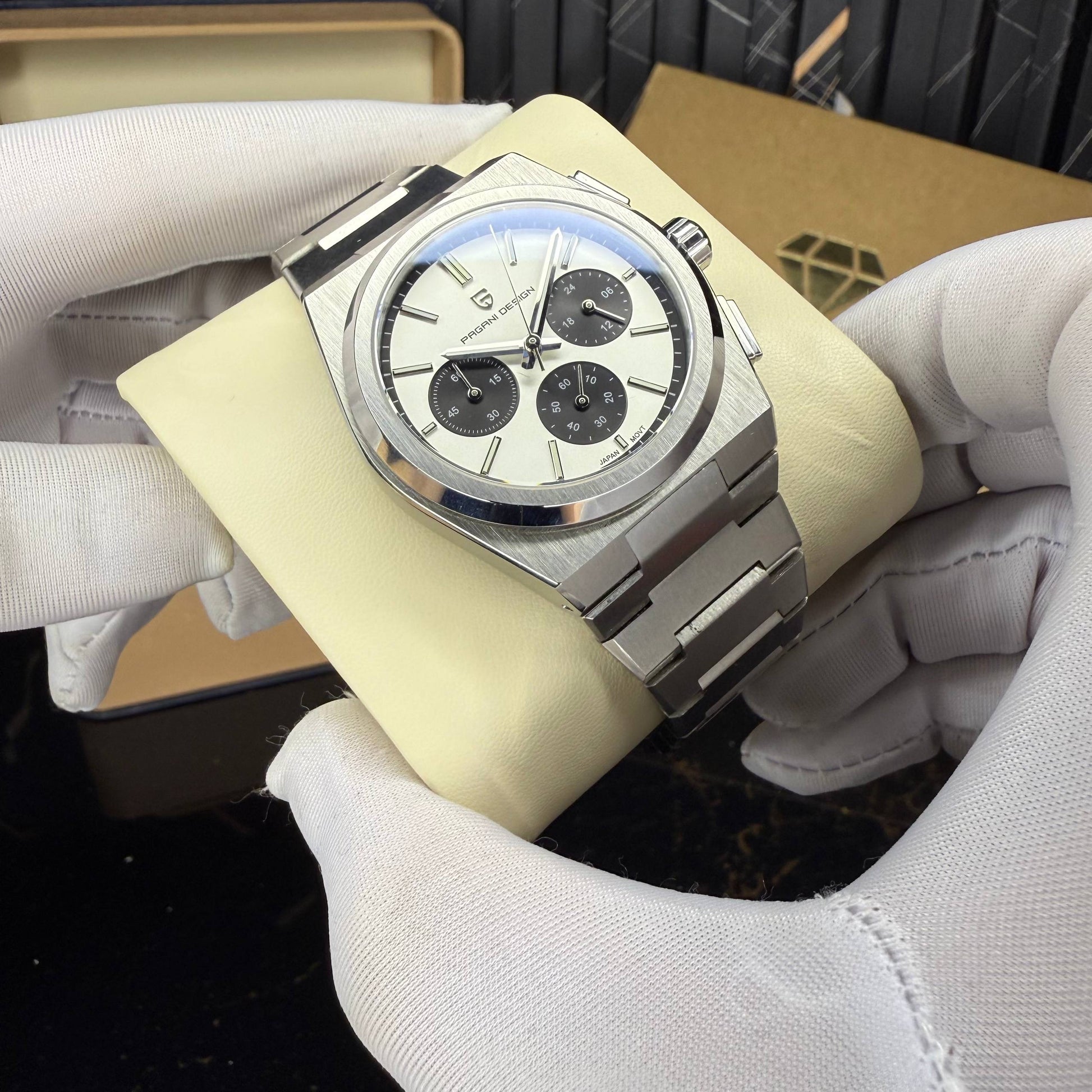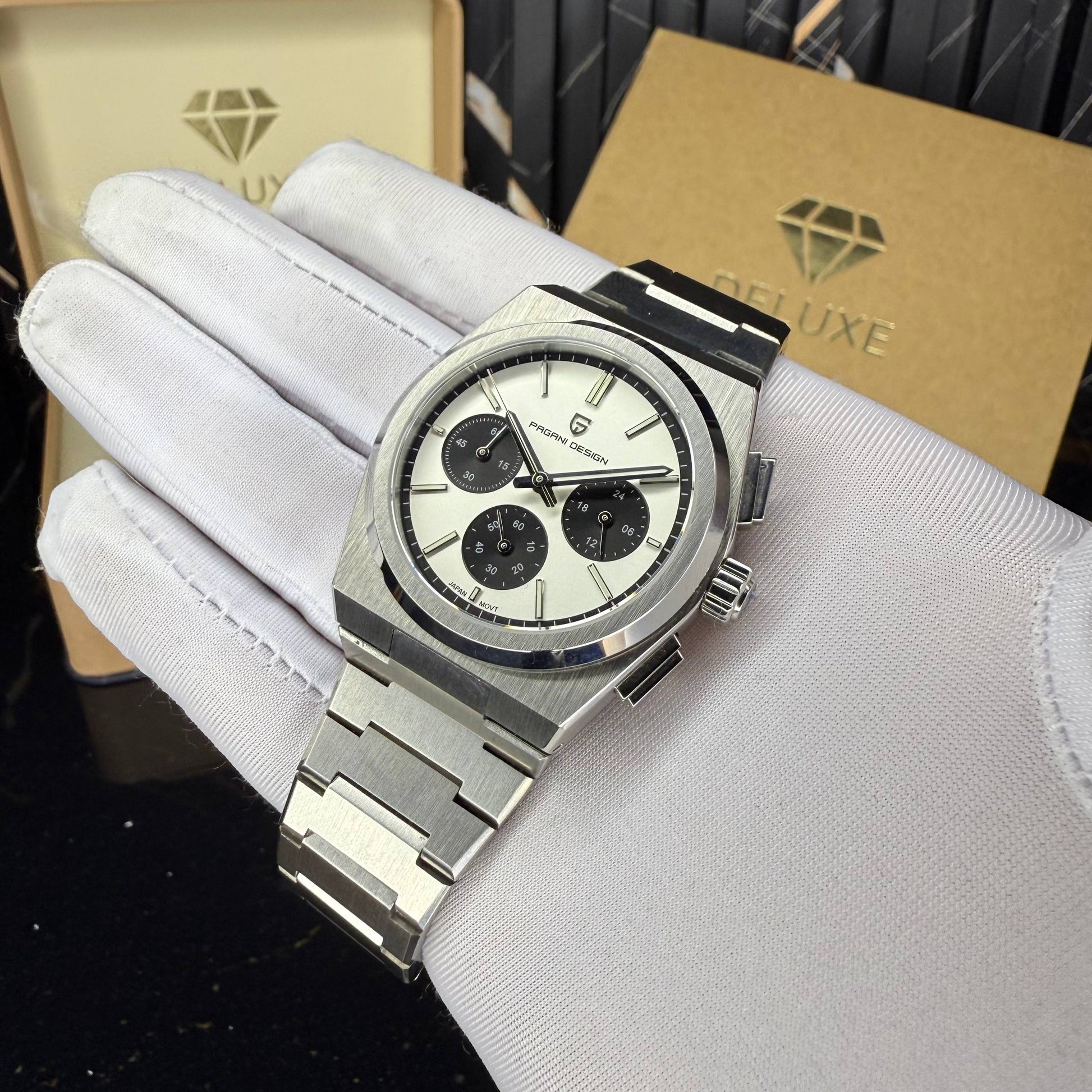 Experience the perfect balance between bold design and everyday performance with this stainless-steel chronograph. Built for men who value precision and presence, this timepiece features a clean white dial contrasted by three deep-black subdials—delivering a striking “panda” aesthetic that watch enthusiasts love.